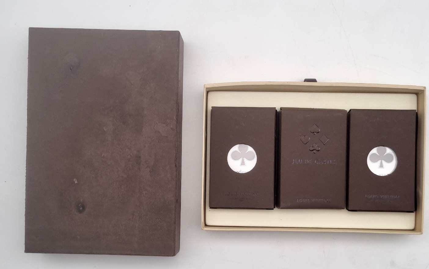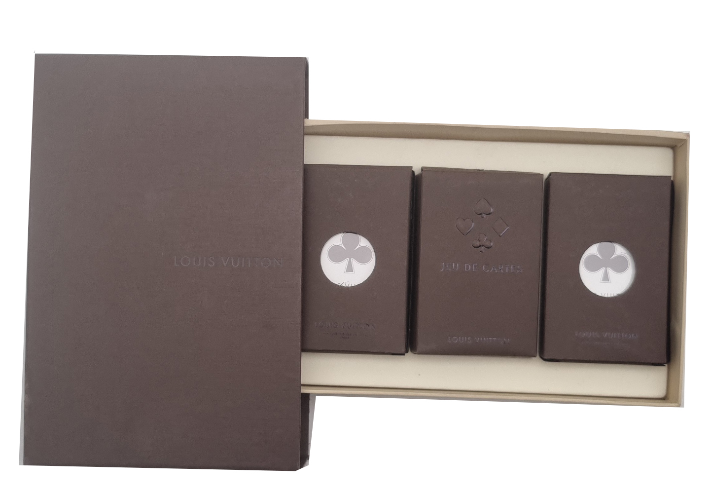 Vuitton, Louis – Jeu de Cartes. Paris, Kartongröße ca. 20,5 x 14 cm, Kartengröße ca. 9 x 6 cm. 3 x 54 Spielkarten in Geschenkbox. Die drei Kartensets (Rückseiten rot, blau und gelb) unbespielt noch in der Originalverpackung und jeweils in der braunen original kartonierten geprägten kleinen Schachtel.Zusammen in der braunen Original-Louis Vuitton-Box. Die Geschenkbox am Rücken und hinten berieben und etwas fleckig.