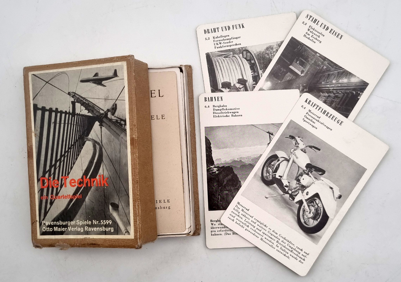 Die Technik ein Quartettspiel. Ravensburg, Ravensburger Spiele, ca. 1950er Jahre. Ca. 13,5 x 9 cm (Kartongröße). 40 Karten. Illustrierte Original-Schachtel. Ravensburger Spiele Nr. 5599. Mit den Rubriken: Kraftfahrzeuge, Bahnen, Elektrizität, Schiffe und Häfen, Flugzeuge, Straßen und Brücken, Kraftquellen, Maschinenbau, Draht und Funk, Stahl und Eisen. Schachtel leicht bestoßen, Hinterdeckel fleckig.