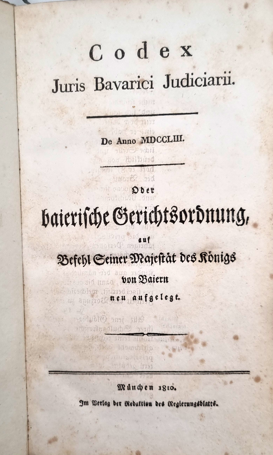 Codex Juris Bavarici Judiciarii. De Anno MDCCLIII. Oder baierische Gerichtsordnung auf Befehl Seiner Majestät des Königs von Baiern neu aufgelegt. München, Im verlag der Redaktion des Regierungsblatts, 1810. Ca. 21 x 12 cm. (16) S., 231 Seiten. Ganzledereinband der Zeit mit Rückengoldprägung und geprägtem Rückenschild. Teils leicht stockfleckig, jedoch gutes Exemplar.