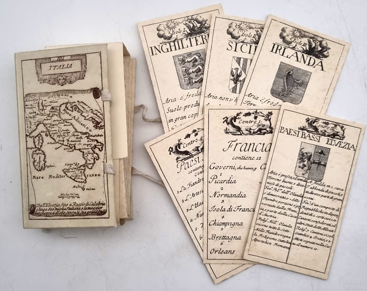 Tarocco geografico dell’Europa. Milano, Edizione Il Meneghello, [1985]. Ca. 12,5 x 7 cm. 78 + 1 Karte. Illustriertes Original-Papp-Portefeuille mit Bindebändchen. Reprint eines Tarock-Kartenspiel aus dem 18. Jhdt. mit historischen geografischen Kartenmotiven. Exemplar Nr. 276/2000.