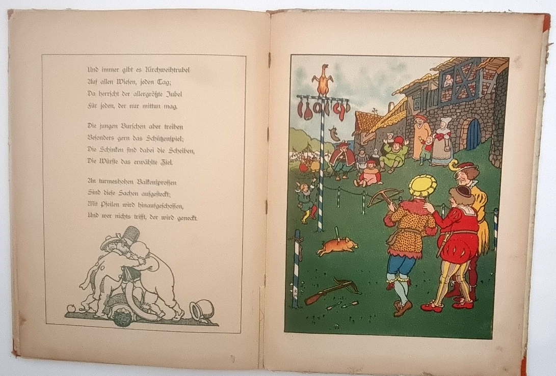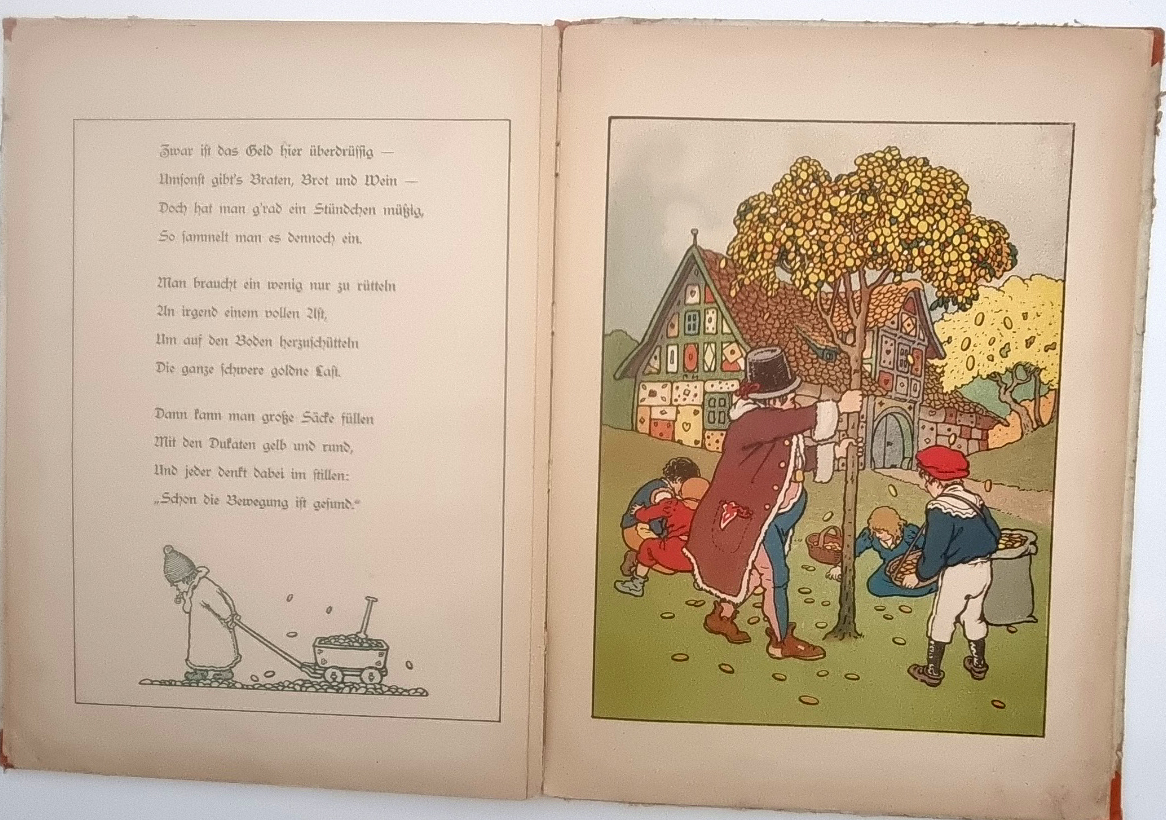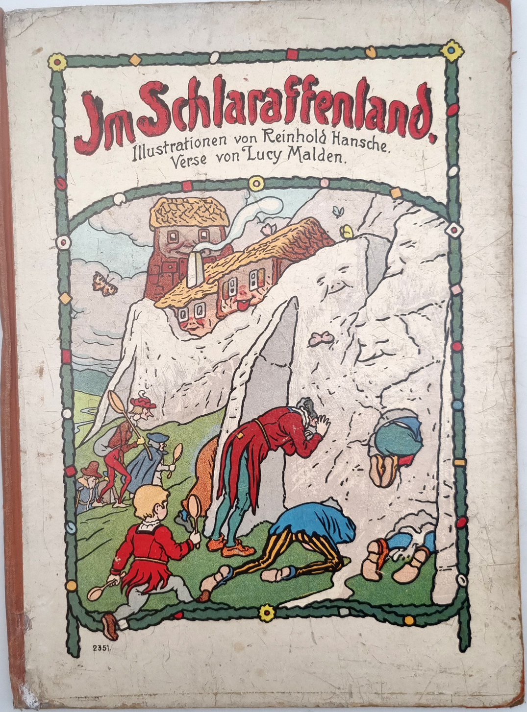 Malden, Lucy (d. i. Lucy Büchenbacher – Mailänder): Im Schlaraffenland. Fürth, G. Löwensohn, o.J., um 1912. Ca. 32,5 x 24 cm. (28) Seiten. Mit farbigem Titelbild und 13 ganzseitigen farbigen Illustrationen von Reinhold Hansche. Farbig illustr. Orig.-Halbleinenband. Verlagsnummer 2351. Einband etwas berieben und Kanten und Rücken bestoßen. Buchblock etwas gelockert, Seiten teils papierbedingt gebräunt.