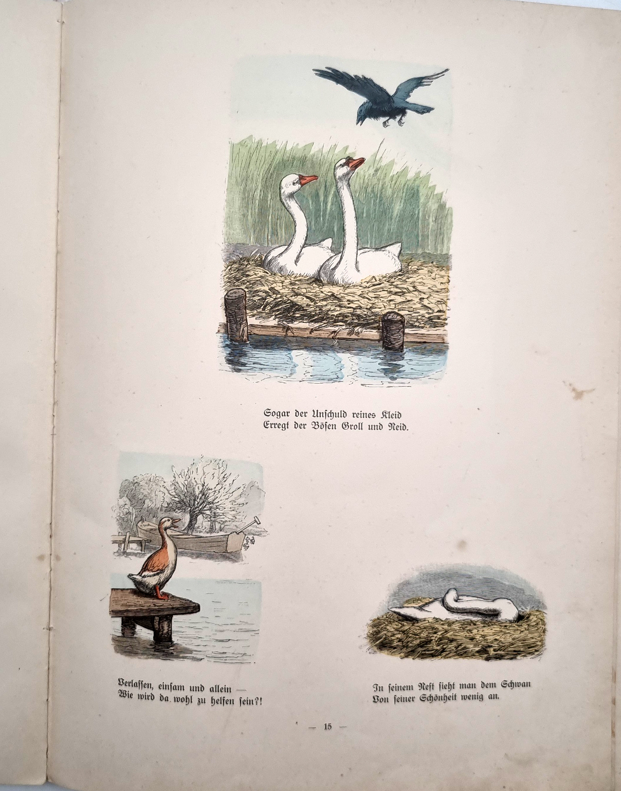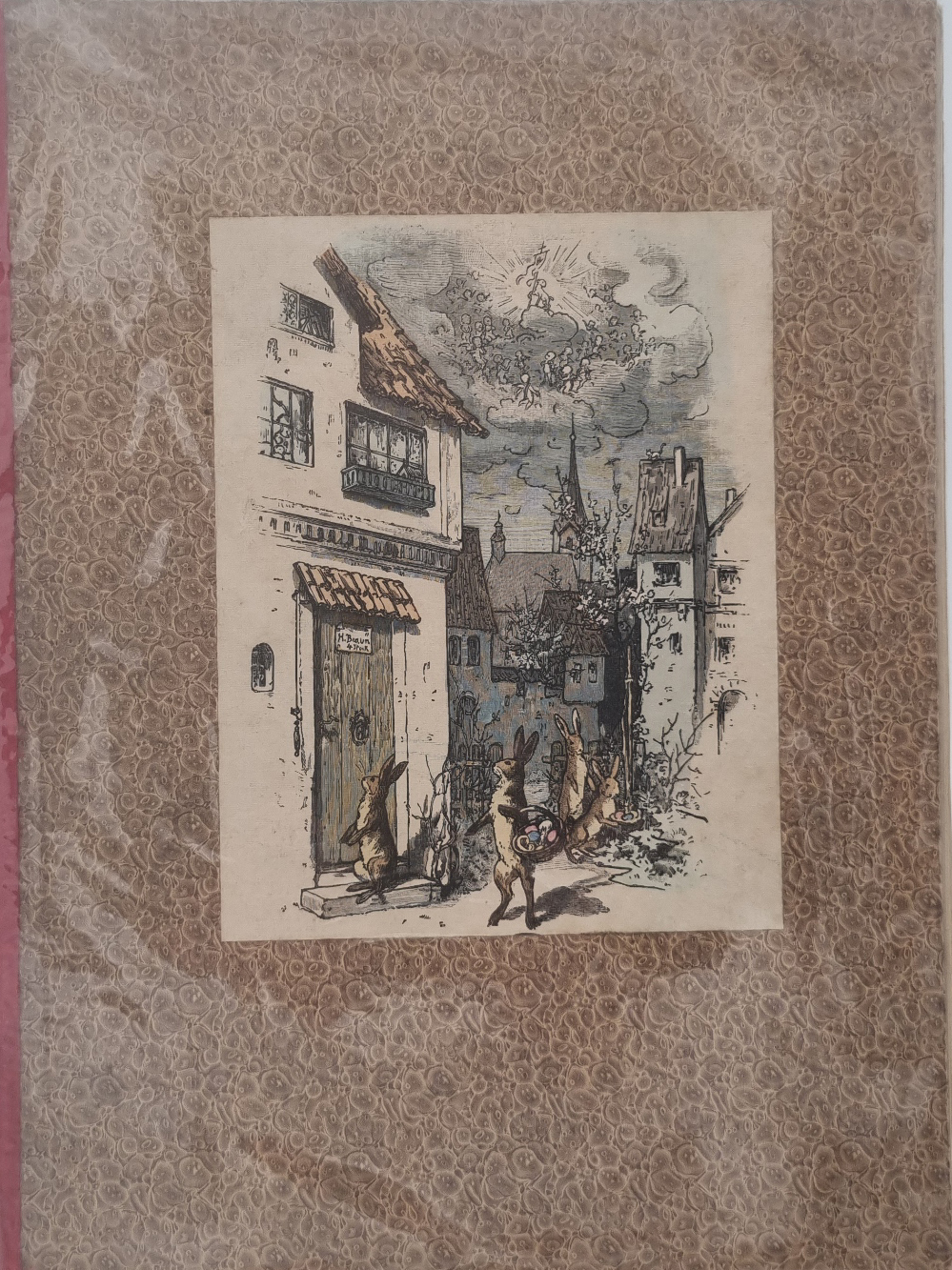 Bunte Bilder für brave Kinder. München, Braun & Schneider, o.J., ca. 1895. Ca. 31 x 23 cm. 24 einseitig bedruckte Blätter. Mit handcolorierten Illustrationen. Halbleinenband mit aufgezogenem Teil-Deckelbild. Vorsätze erneuert. Im Stil der Münchner Bilderbogen.