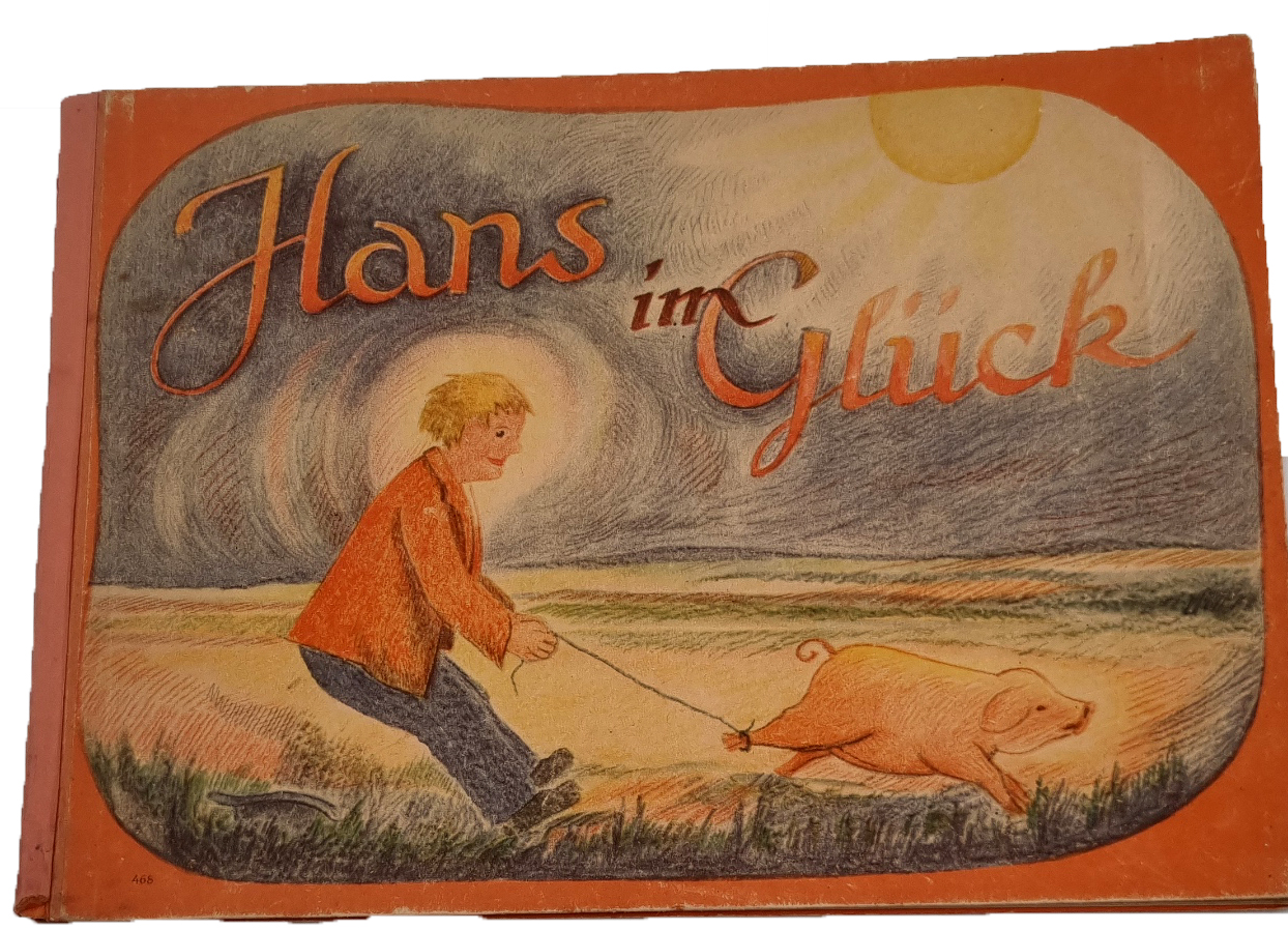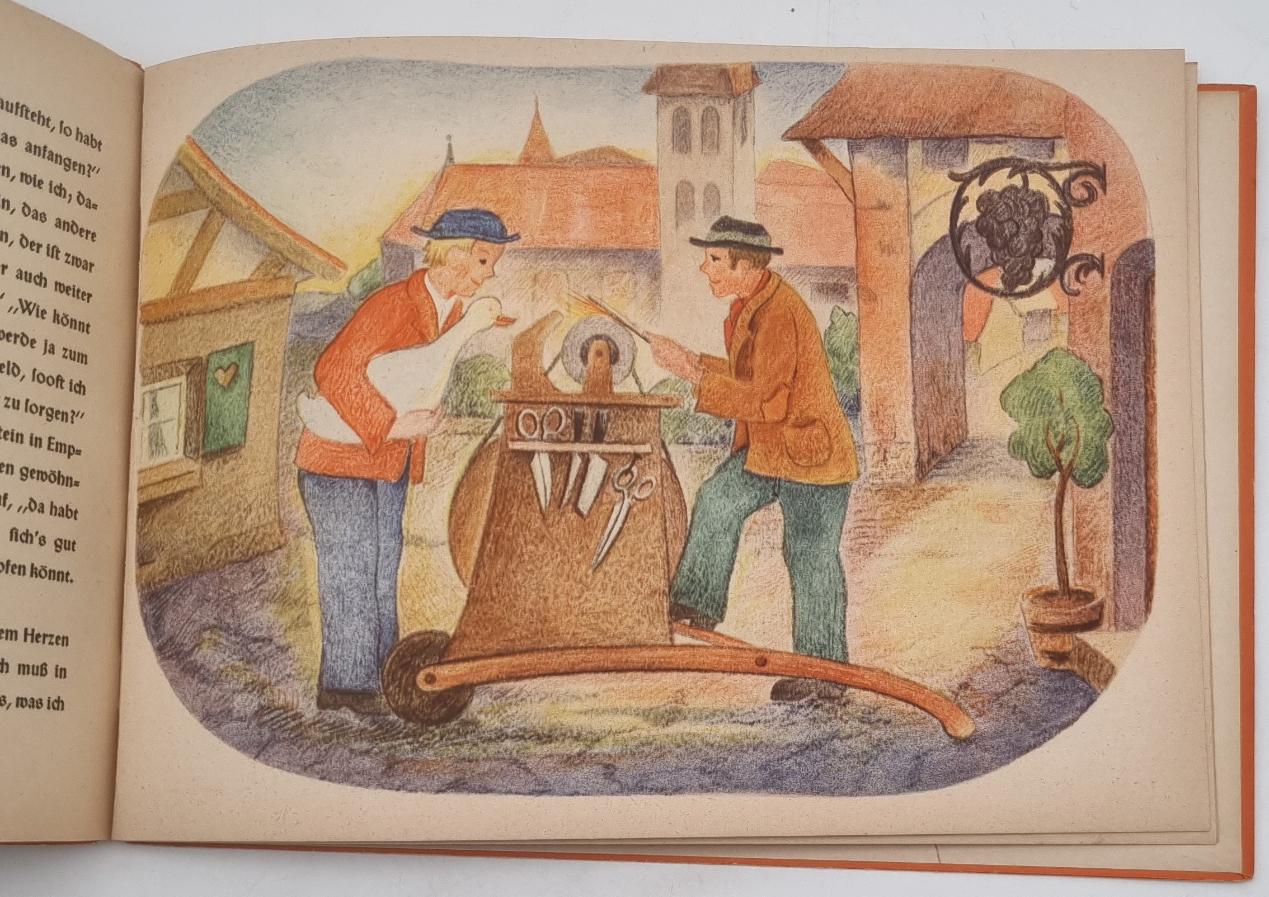 Grimm – Hans im Glück. Ein Bilderbuch nach Grimms Märchen von Walter Ostheimer. Stuttgart, J. Ch. Mellinger Verlag, [1942]. Querformat, ca. 22,5 x 31,5 cm. (14) Seiten mit 7 ganzseitigen Illustraitonen. Farbig illustr. Orig.-Halbleinenband. Anthrophosophisches Bilderbuch. Klotz 9000/497. Gutes Exemplar.