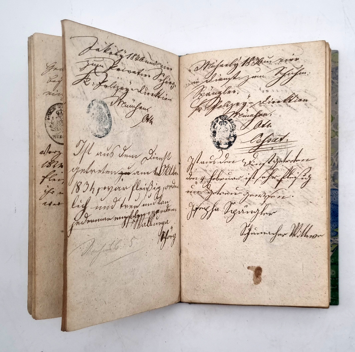 Reichenwallner, Elisabeth – Königreich Baiern – Dienstbothen-Buch. Deutsche Handschrift auf Papier, 1822-1865. Ca. 18 x 11 cm. (60) Seiten. Moderner Pappband. Komplett ausgefülltes Dienstbotenbuch über einen Zeitraum von 40 Jahren. Handschriftliche Zeugnisse und Bestätigungen für Elisabeth Reichenwallner aus Pfarrkirchen. Sie übte ihre Tätigkeit als Köchin in zahlreichen Stellen in Pfarrkirchen, Altötting, München etc. aus.