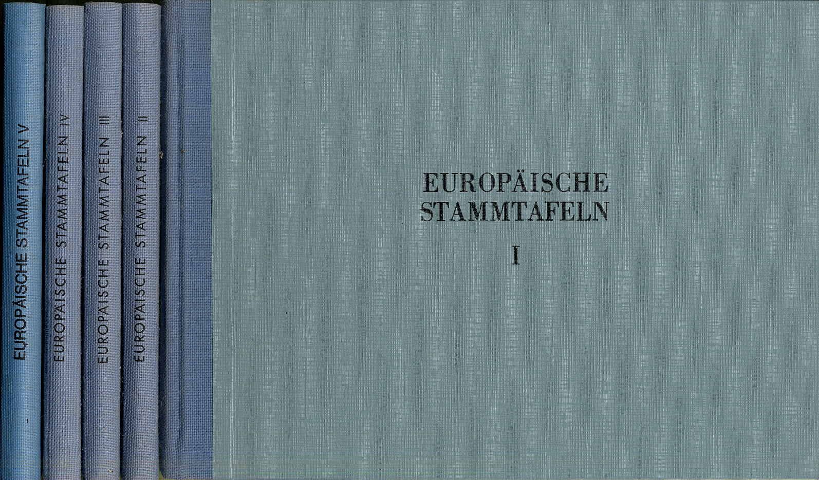 Isenburg, Wilhelm v., Frank Freytag v. Loringhoven: Europäische Stammtafeln. Stammtafeln zur Geschichte der europäischen Staaten. Berichtigter und ergänzter Abdruck der 2. verbesserten Auflage von 1953 bzw. unveränderter Abdruck der 3. Auflage; unveränd. Nachdruck der 2. Auflage von 1968. Bände I bis V. Marburg, J. A. Stargardt, 1975-1978. Ca. 21,5 x 29,5 cm. Orig.-Halbleinenbände. Band I: Die deutschen Staaten; Band II: Die außerdeutschen Staaten; Band III; Band IV; Band V (aus dem Nachlass hrsgg. von Detlev Schwennicke). Bei den Bänden III, IV und V handelt es sich jeweils um Ergänzungsbände. Gutes Exemplar.