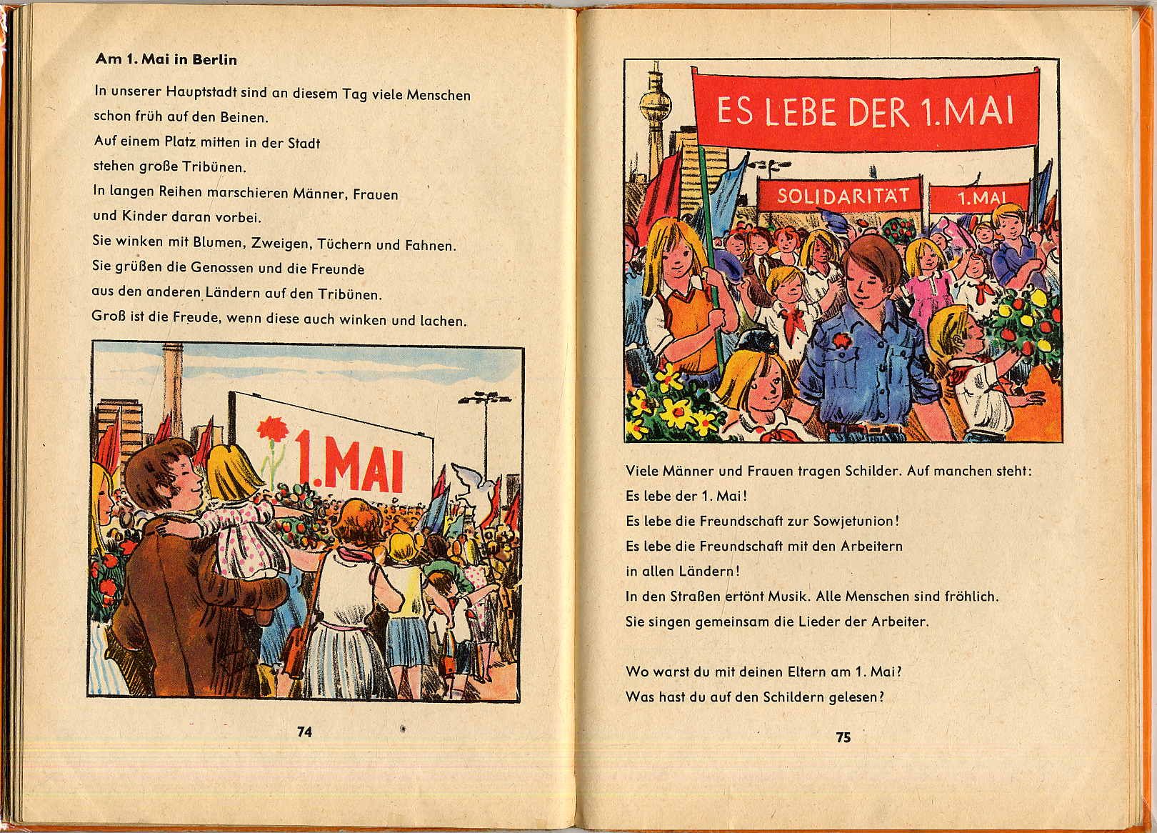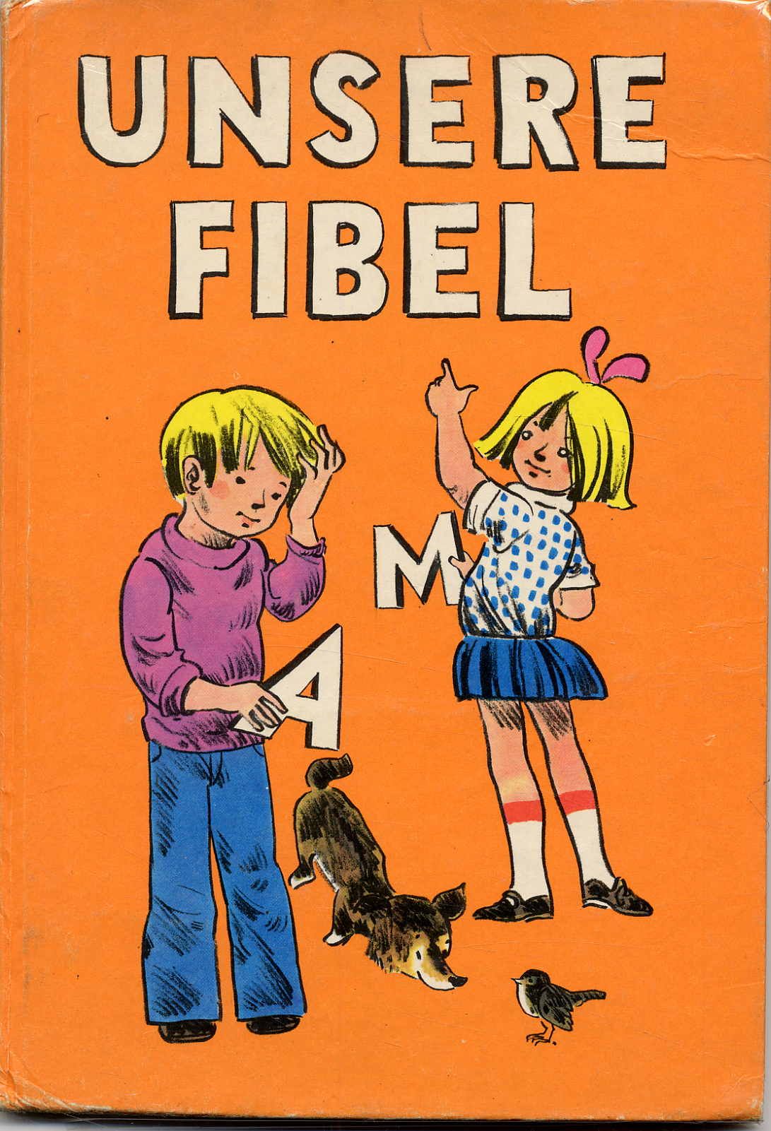 [Krowicki, Maria, Ilse Liebers, Klara Schürmann und Dorothea Türk: Unsere Fibel. 16. Auflage. Berlin, Volk und Wissen Volkseigener Verlag, 1989. Ca. 27,5 x 19 cm. 111 Seiten. Mit farbigen Illustrationen von Werner Klemke. Farbig illustr. Orig.-Pappband. Lesen lernen H-6 (2. Aufl. 1974): „In dieser Fibel aus der DDR wird ein ganzheitlicher Leselehrgang in Druckschrift angeboten, der mit Wörtern beginnt, jedoch sofort auch einzelne Buchstaben herausstellt. Und schon sehr früh wird die Schreibschrift ebenfalls vorgestellt. … Die Fibeltexte sprechen eine beachtliche Themenvielfalt an, in der vor allem auch das gesellschaftliche Leben in der DDR stark beachtet und hervorgehoben wird.“ Aus dem Inhalt u.a.: „Besuch zum 1. März“ (Soldat der Volksarmee); „Neubauten“; „In der LPG ‚Frieden‘“; „Kennt ihr die Berufe eurer Eltern?“; „Alle freuen sich auf den 1. Mai“; „Der erste Menschim Weltraum“. Gutes Exemplar dieser letzten DDR-Fibel.