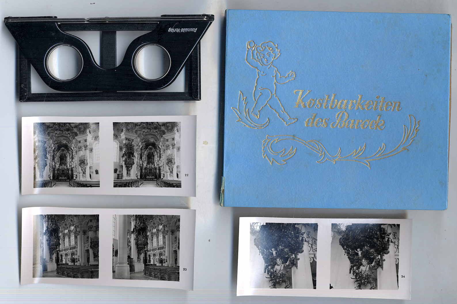 Raumbilder – Kostbarkeiten des Barock in bayerischen Kirchen und Klöstern. Oberaudorf, Schönstein, ca. 1950. Querformat, ca. 14,5 x 16,5 cm. (4) Seiten Text. Mit 24 Stereobildern (+ 21 weitere Stereobilder). Mit Betrachterbrille. Blaue Original-Pappschachtel mit Goldprägung. Zu den 24 Raumbildern sind noch weitere 21 Raumbilder aus der Serie „Meisterwerke profaner Bau- und Raumkunst des 17. u. 18. Jahrhunderts“ beigefügt. Schachtelrücken mit kleinem Einriss. Die Stereobilder leicht gewölbt, sonst guter Zustand.