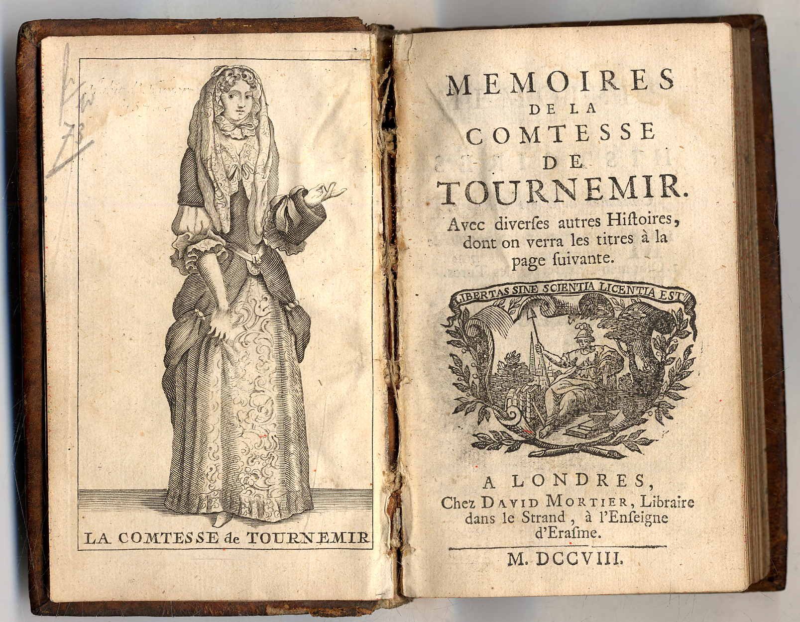 Anonym – Memoires de la Comtesse de Tournemir. Avec diverses autres Histoires dont on verra les titres à la page suivante. 2 Teile in einem Band. Londres (d.i. Amsterdam), David Mortier, 1708. Ca. 13 x 8,5 cm. (6) S., 216 Seiten; 136 Seiten. Mit Holzschnitt-Titelvignette und gestochenem Frontispiz (Porträt Comtesse de Tournemir). Ledereinband der Zeit. Der erste Teil enthält die Memoiren, daran anschließend: Histoire d’Othoman et de Roselie; Habis, Roi d’Espagne; der 2. Teil mit gesonderter Paginierung: Caligula empereur de Rome, nouvelle historique; daran anschließend Pelage I. Roi de Leon, nouvelle historique. Mit mit altem Nummernaufkleber und zwei kleineren Fehlstellen. Besitzeintrag von alter Hand auf Innendeckel. Text auf französisch.