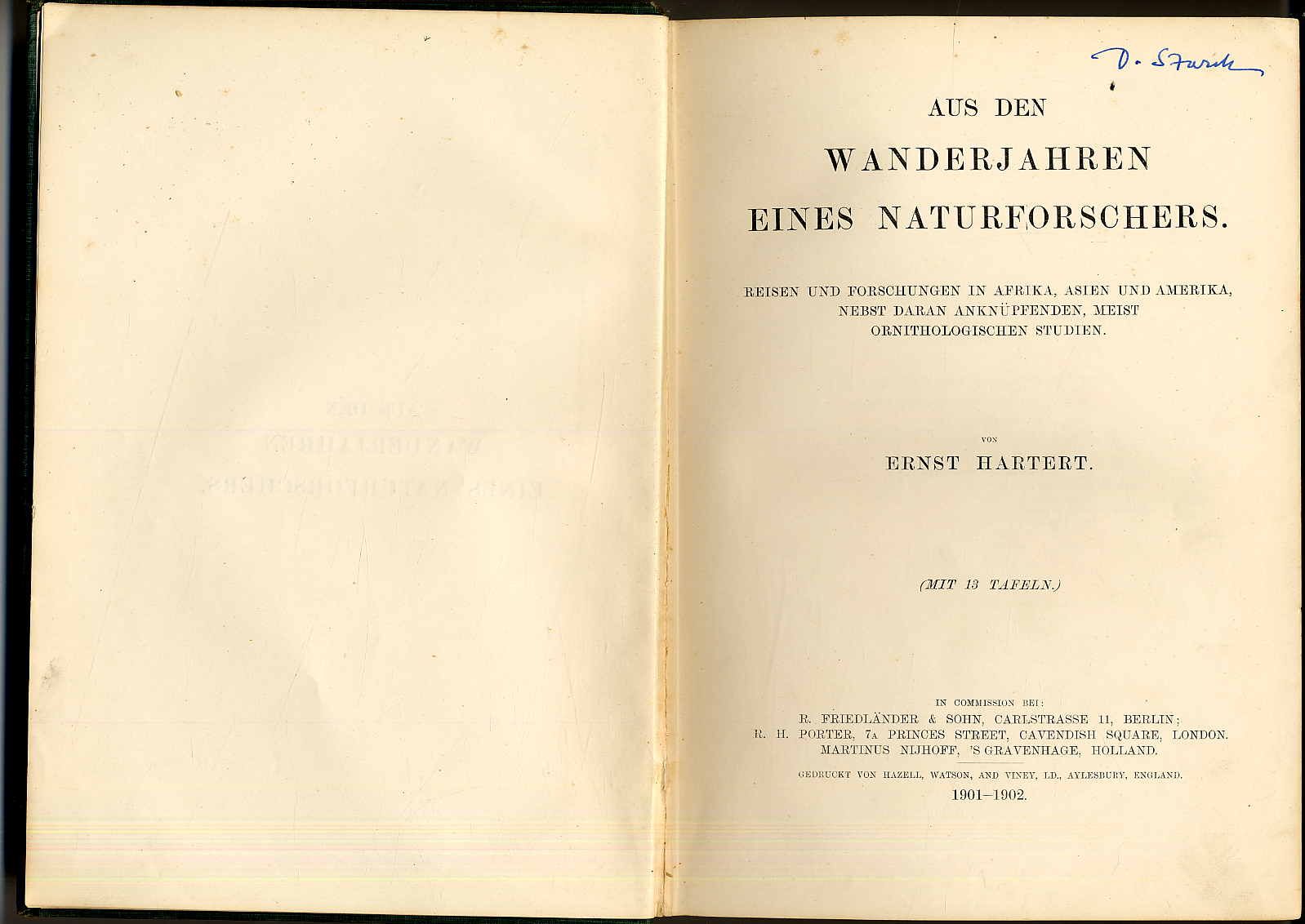 Hartert, Ernst: Aus den Wanderjahren eines Naturforschers. Reisen und Forschungen in Afrika, Asien und Amerika, nebst daran anknüpfenden, meist ornithologischen Studien. Berlin, In Commission bei R. Friedlaender u.a., 1901-1902. Ca. 28 x 19,5 cm. XIII S., (3) S., 329 Seiten. Mit 13 Tafeln mit Abbilidungen und Karten. Grüner Orig.-Leinenband. Rücken bestoßen, mit kleinen Fehlstellen, Vorsatz gelockert. Mit Exlibris. Namenszug auf Vorsatz und Titelblatt. Aus dem Inhalt u.a.: Reise nach Sokoto und Kano im westlichen Sudan; Reise nach Sumatra, Malakka und Indien; … nach den Inseln des caribischen Meeres; Frühlingsausflug nach Marokko und Tenerife.