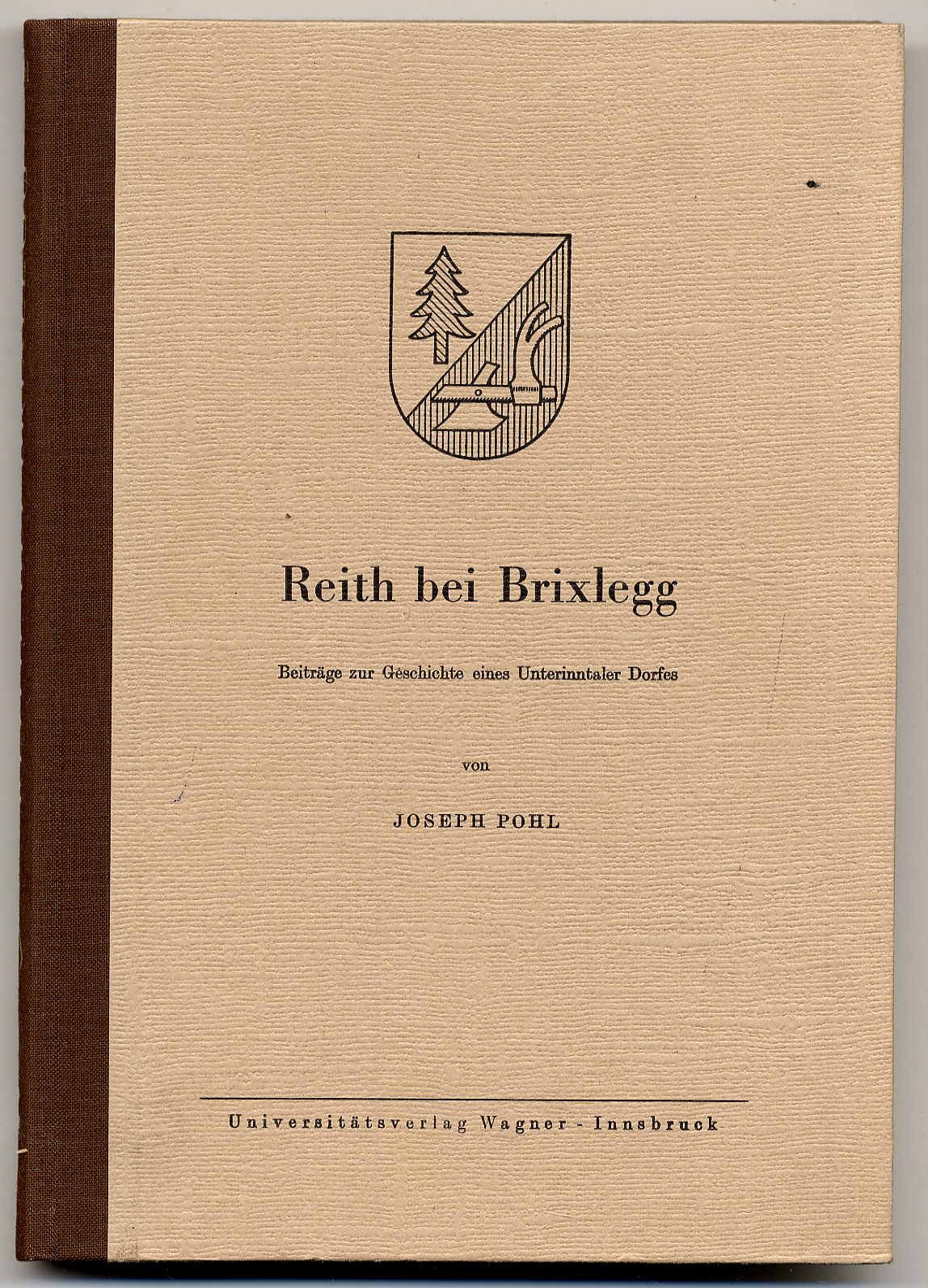 Pohl, Joseph: Reith bei Brixlegg. Beiträge zu Geschichte eines Unterinntaler Dorfes. Innsbruck, Universitätsverlag Wagner, 1959. Ca. 24,5 x 17 cm. VIII S., 268 S., (4) Seiten. Mit Abbildungen auf 3 Tafeln. Orig.-Halbleinenband. Aus der Reihe: Schlern-Schriften. Stempel und Datum auf Titelblatt. Gutes Exemplar.