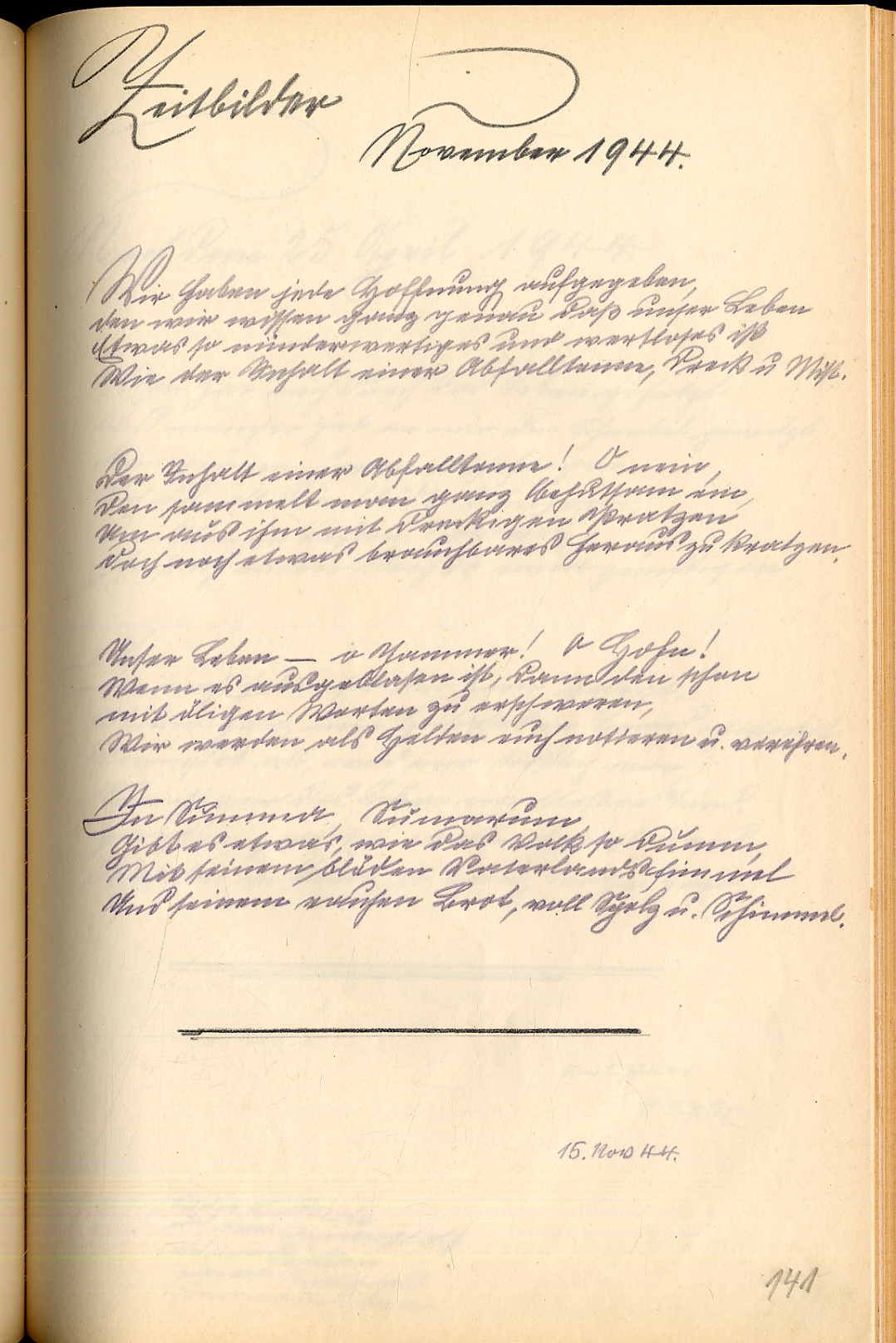 Beer-Neukam, Hanswolf: Handgeschriebene Gedichte (teils Originalhandschrift, teils hektographiert). Deutsche Handschrift auf Papier. München (?), 1943-1948. Ca. 29,5 x 20,5 cm. 223 einseitig beschriebene Blatt. Erste Seite mit farbiger Zeichnung (signiert F.G.) Halbleinenband der Zeit. Auf verschiedenfarbigem Papier. Gutes Exemplar.