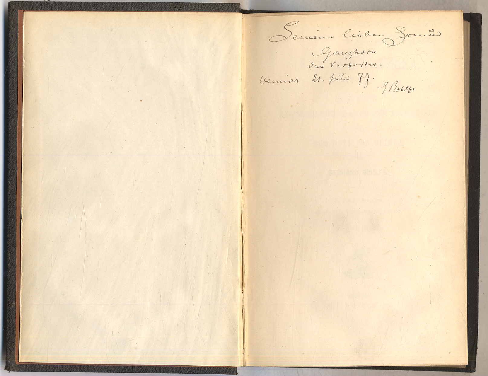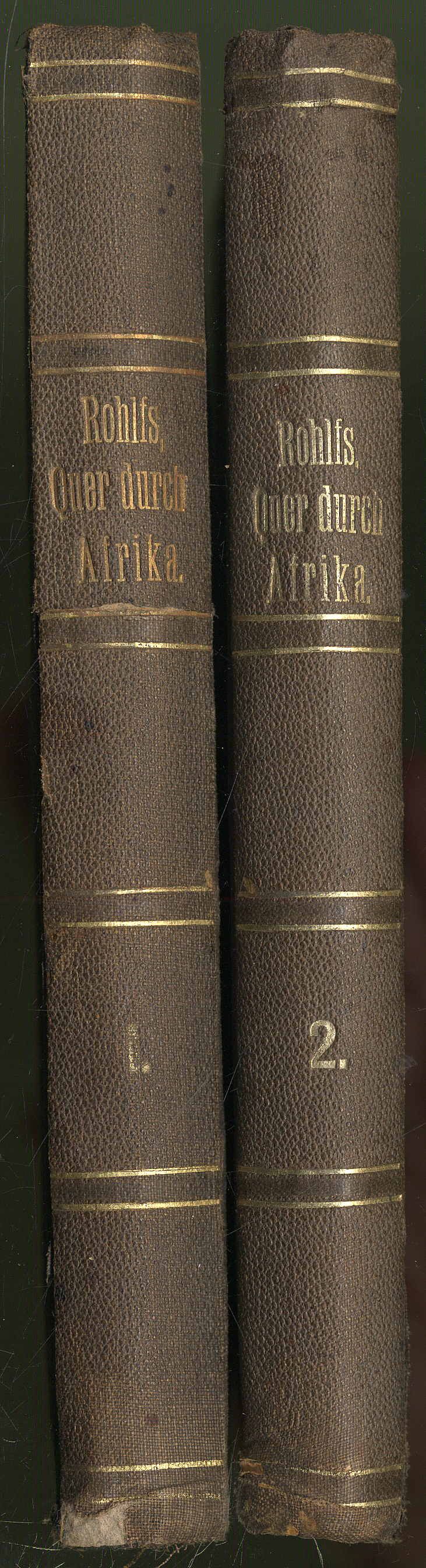 Rohlfs, Gerhard: Quer durch Afrika. Reise vom Mittelmeeer nach dem Tschad-See und zum Golf von Guinea. In zwei Theilen. 2 Bände. Leipzig, F.A. Brockhaus, 1874-1875. Ca. 22 x 14,5 cm. X S., 352 Seiten, mit einer farbigen, mehrfach gefalteten, lithographierten Karte; VIII S., 298 S., (2) Seiten, mit einer farbigen, mehrfach gefalteten, lithographierten Karte. Schwarze Leinenbände der Zeit mit geprägten Rückentiteln. Beide Bände jeweils mit eigenhändiger Widmung und Unterschrift „Seinem lieben Freund …“ datiert Weimar 21.6.77. Erste Ausgabe. Rücken mit kleineren Fehlstellen. Besitzvermerke auf Titelblatt. Seiten papierbedingt gebräunt und mit Bleistiftanstreichungen bzw. -anmerkungen. Rohlfs (1831-1896, Deutscher Afrikaforscher). „Ich übergebe hiermit dem Publikum die Schilderung meiner in den Jahren 1865-1867 ausgeführten Reise durch die Grosse Wüste zum Tschad-See, nach Bornu und Uándala, durch die Haussa- und Pullo-Länder nach Lokoja am Niger und nach dem Nupe- und Joruba-Lande.“ (Vorwort). „In die Heimat zurückgekehrt, konnte er als der beste Sahara-Kenner gefeiert werden.“ Henze 4, 653.
