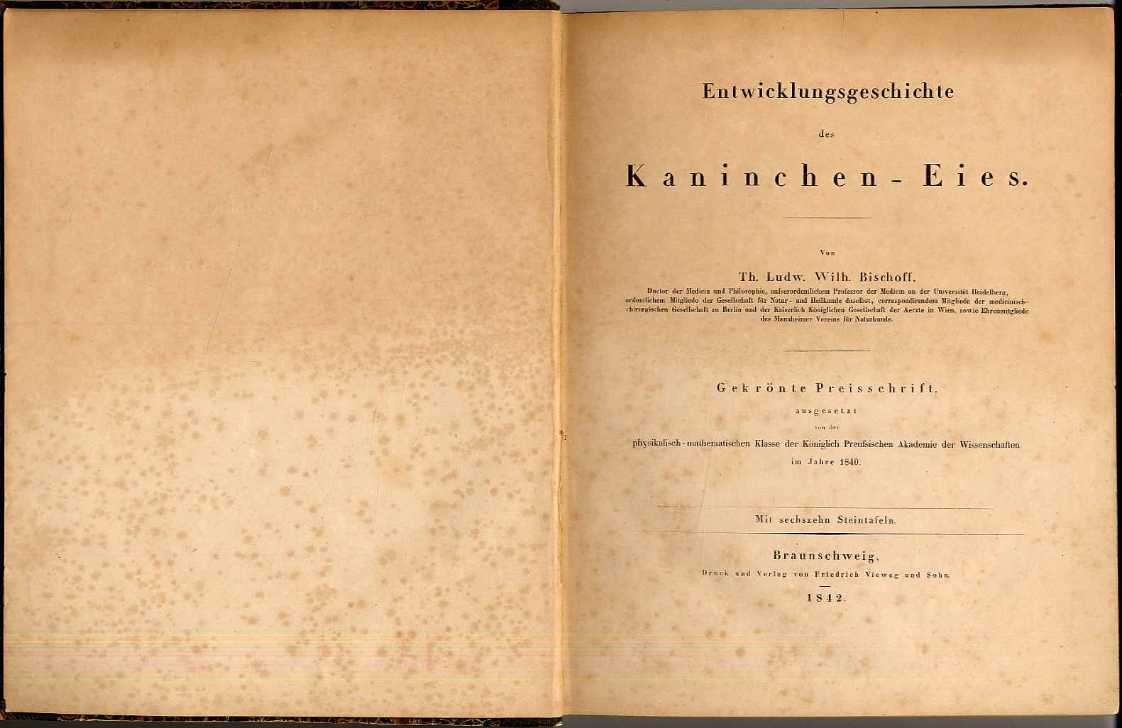 Bischoff, Th[eodor] Lud. Wilh.: Entwicklungsgeschichte des Kaninchen-Eies. Braunschweig, Friedrich Vieweg und Sohn, 1842. Ca. 27,5 x 21,5 cm. X S., 154 Seiten. Mit 16 lithographierten Tafeln (davon 1 farbig). Pappband der Zeit. Rücken mit Papierstreifen überklebt. Einband bestoßen. Namenszug auf Vorsatz. Innen gebräunt und teils stockfleckig (anfangs stärker). Eine Tafel lose. Gekrönte Preisschrift ausgesetzt von der physikalisch-mathemtiaschen Klasse der Königl. Preuß. Akademie der Wissenschaften im Jahre 1840. Bischoff (1807-1882, Anatom und Physiologe), lehrte in Gießen, war drei Jahrzehnte mit Justus Liebig befreundet.