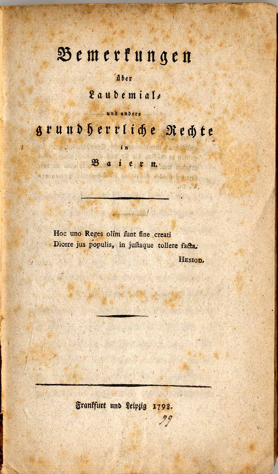 [Rottmanner, Simon]: Bemerkungen über Laudemial- und andere grundherrliche Rechte in Baiern. Frankfurt und Leipzig, 1798. Ca. 21 x 12,5 cm. XXIV S., 206 Seiten. Pappband der Zeit. Mit handschriftl. Einband etwas bestoßen, Rücken stärker und mit Abrieb einer entfernten Überklebung. Notizen auf Innendeckel sowie Exlibris. Seiten teils gebräunt bzw. stockfleckig. Holzmann-Bohatta 1, 5212. Rottmanner (Kameralist, Agrarreformer, 1740-1813) zählt zu den Begründern einer modernen Forstwissenschaft in Bayern. „1778-1800 trat er durch umfangreiche Publikationstätigkeit über Staats- und Privatwirtschaft, über Steuer- und Abgabenlast der Bauern sowie die Ständeverfassung an die Öffentlichkeit. … Seine zumeist anonymen Schriften ab 1794, mit denen sich R. u. a. gegen das herrschaftliche Laudemium, gegen Korruption und Mißstände in der Güterverwaltung, gegen Übergriffe der herrschaftlichen Jagd auf bäuerliche Nutzungsflächen wandte und für die Freiheit und Eigentumsrechte der bayer. Bauern eintrat, wurden als „geistige Vorbereitung der Bauernbefreiung“ (Heinz Haushofer) gewertet. (A.O. Weber in NDB 22, S.145-146).