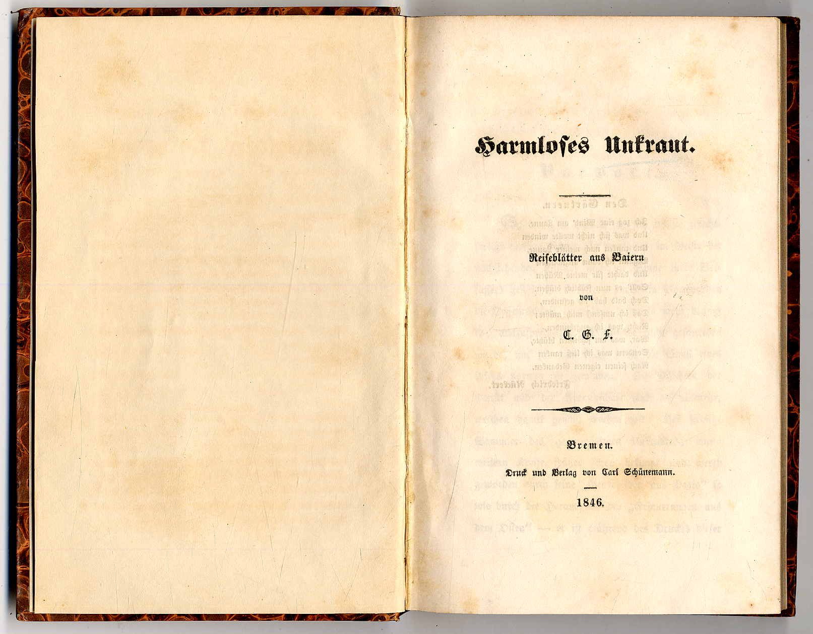 F[rege], C[hristian] G[ottlob]: Harmloses Unkraut. Reiseblätter aus Baiern. Bremen, Carl Schünemann, 1846. Ca. 20,5 x 13,5 cm. IV S., (2) S., 250 Seiten. Späterer Pappband. Seiten teils etwas stockfleckig. Posthum erschienen „Fern von der theuern Heimath, in Italien, wohin er mit bitterm Widerwillen, mit dunkeln und bangen Vorgefühlen gezogen war, um von unheilbaren Leiden Heilung zu suchen, unter dem Einflusse der gepriesenen Luft von Pisa mußte er nach langer, schmerzhafter Krankheit demselben harten und stürmenden Winter, der in unserem Deutschland der mildeste war, im kräftigen Mannesalter erliegen! Die Sorge um diese Blätter war eine seiner letzten und liebsten.“ (Vorwort). „Die Bewohner des bairischen Hochlandes sollen brav und beider sein. Abgeschnitten von der Welt sind sie genug, daß man dies für sie hoffen darf! Im Aeußern gleichen sie den Tyrolern: gerade Nasen, dunkle Augen, breite Schultern, hochaufrechter, freier Gang. Doch liegt etwas zwischen ihren buschigen Augenbrauen, was mir schlech tzu ihrem servilen Wesen zu passen scheint.“ (S. 111).