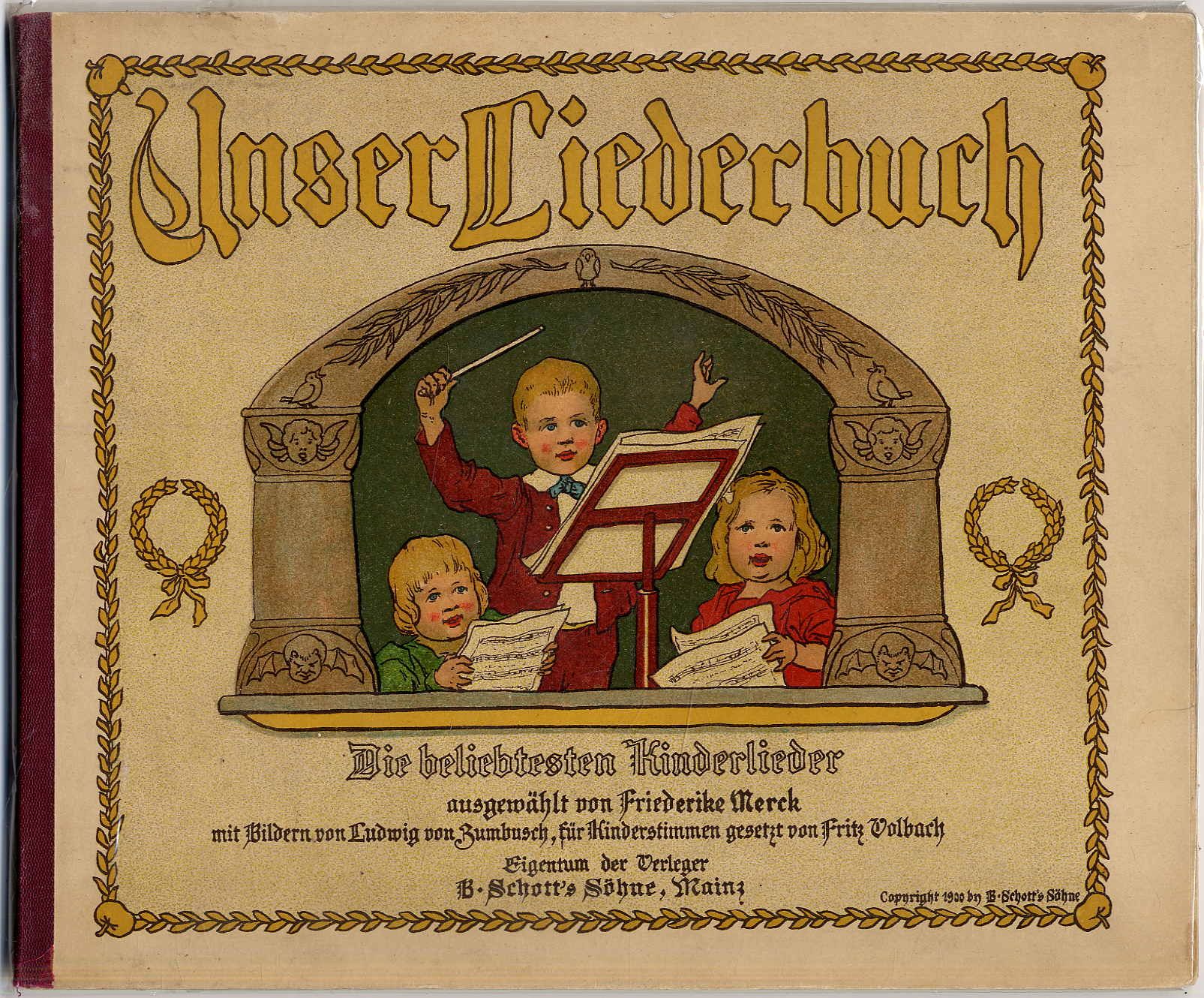 Merck, Friederike: Unser Liederbuch. Die beliebtesten Kinderlieder ausgewählt. Für Kinderstimmen gesetzt von Fritz Volbach. 1. Band. Mainz, B. Schott’s Söhne, 1900. Querformat, ca. 21,5 x 25,5 cm. 47 S. Mit zahlreichen farbigen Lithographien von Ludwig von Zumbusch. Orig.-Halbleinenband. Ries 993 und 308: „… zeigen … den nahtlosen Übergang aus der chromolithographischen Technik in die sorgfältig gearbeitet farbige Lithographie der Zeit um und nach 1900.“ Schnitt am unteren Eck etwas fleckig, sonst gutes Exemplar.