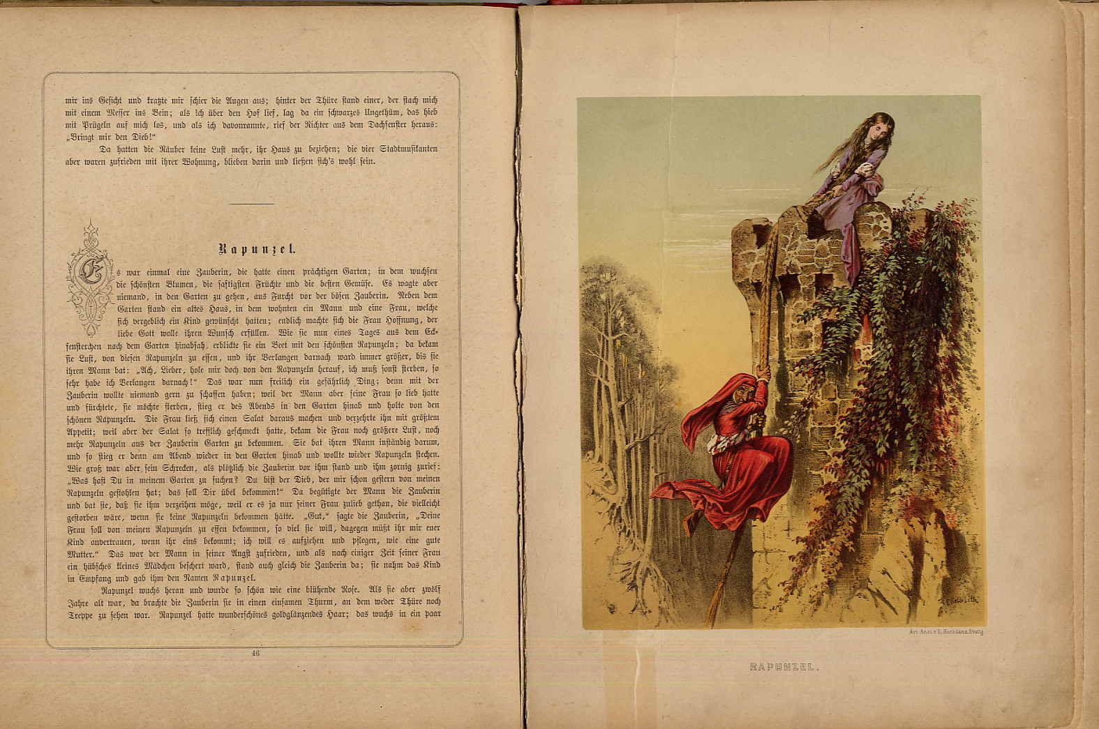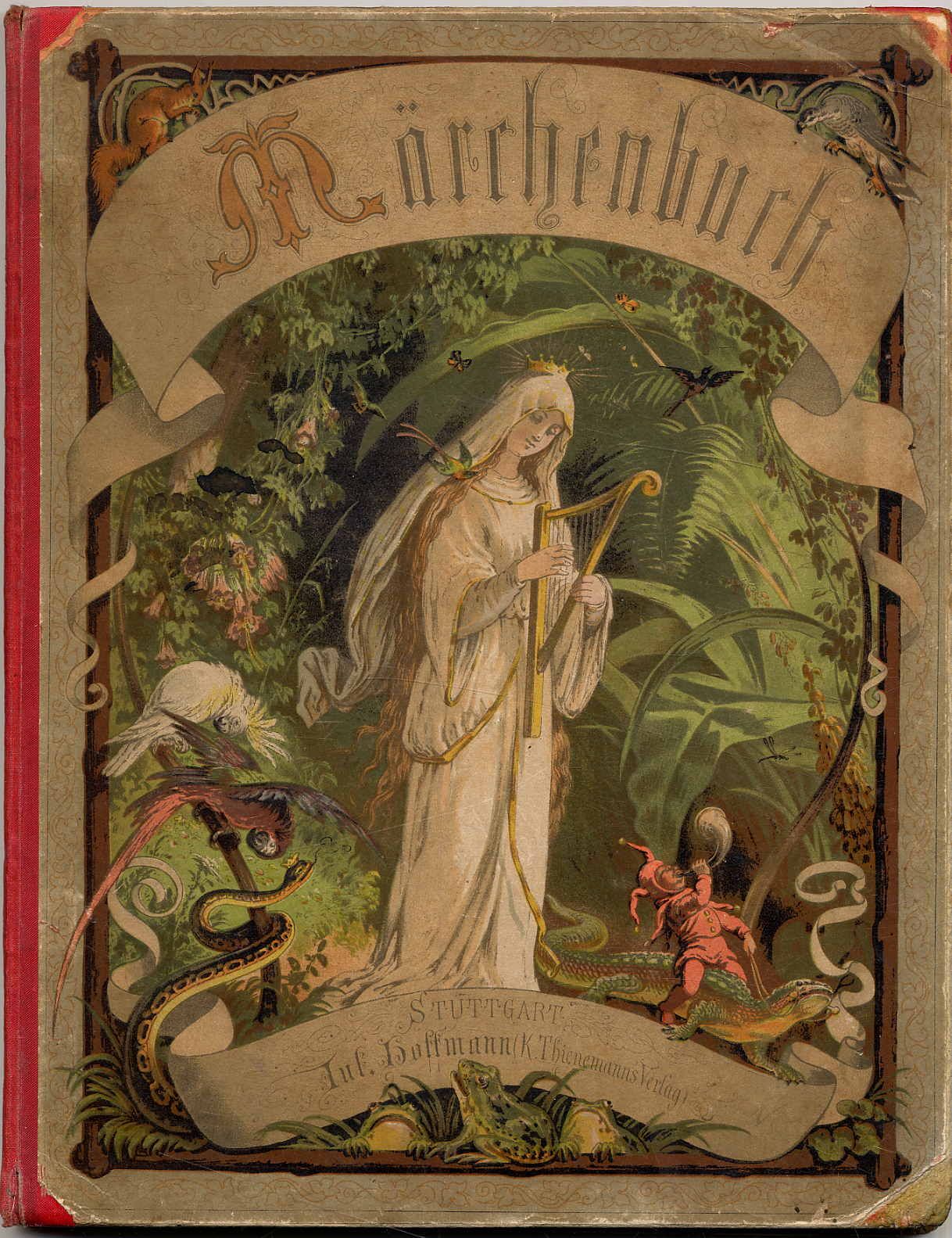 Hoffmann, J[ulius]: Märchenbuch für die Jugend. Eine Auslese der schönsten deutschen Märchen gesammelt und bearbeitet. Stuttgart, Julius Hoffmann, [1879]. Ca. 29,5 x 22,5 cm. 68 Seiten. Mit 9 ganzseitigen Farblithographien nach Aquarellen von C. Offterdinger. Farbig illustr. Orig.-Halbleinenband. Ries 753,37: „Offterdinger … einer der führenden Kräfte der zweiten Jahrhunderthälfte“. Einbandkanten etwas bestoßen. Vorsätze erneuert. Seitenränder etwas fingerfleckig und teils leicht angerändert. Mit 9 prächtigen Tafeln. U.a. mit folgenden Märchen: Hänsel und Gretel, der Dumme, Der gestiefelte Kater, Blaubart, Aschenbröderl, Der Däumling, Der dienstfertige Fuchs, Prinzessin Sternröschen, Schneewittchen, Frau Holle, Rapunzel, Dornröschen, Zwergenmützchen, Rothkäppchen, Der Pfennig, Hans im Glück.