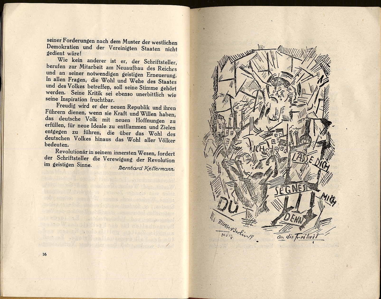 An alle Künstler! Berlin, 1919. 8°. 47 S. Mit Bildbeiträgen von Cesar Klein, Richter-Berlin, Lyonel Feininger, Milly Steger und Georg Tappert. Orig.-Broschur, farbig illustr. von Max Pechstein. Mit literarischen Beiträgen von Joh. R. Becher, Ludwig Meidner, Bernhard Kellermann, Max Pechstein, Walter Hasenclever, Kurt Eisner, Konrad Haenisch, Kurt Erich Meurer und Paul Zech. Mittig mit leichtem Knick. Ein Blatt am unteren Rand etwas knitterfaltig und mit kleinem Einriss.