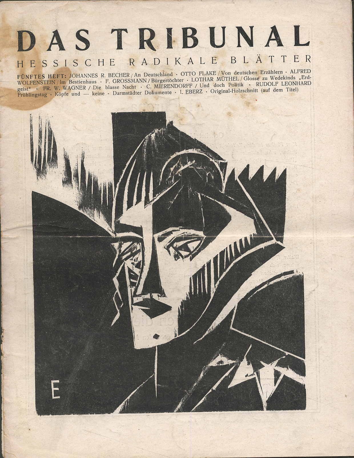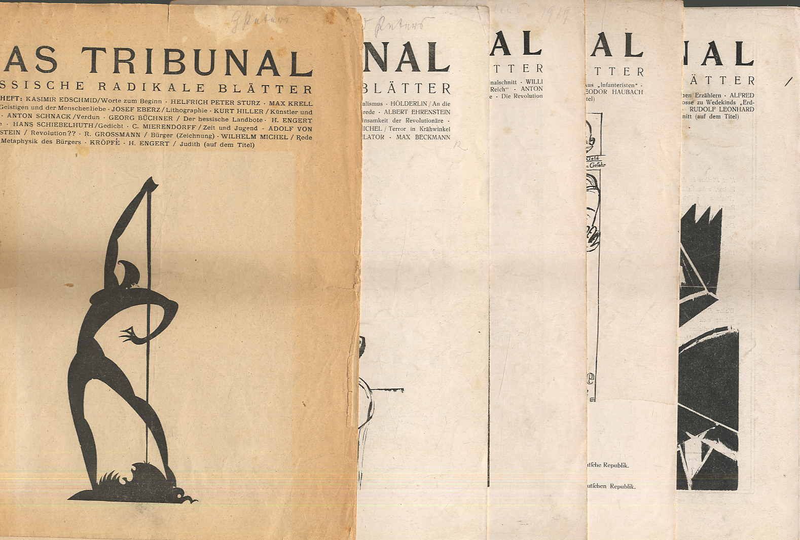 Mierendorff, C[arlo] (Hrsg.): Das Tribunal. Hessische Radikale Blätter. In Gemeinschaft mit Freunden herausgegeben. 1. Jahrgang, Hefte 1-5. Darmstadt, Verlag Die Dachstube, 1919. Ca. 28,5 x 22 cm. (68) Seiten (incl. den Umschlägen). Mit Illustrationen (u.a. einer Titelzeichnung von Max Beckmann) sowie Lithographie von Josf Eberz, Edwin Scharff, G. Gunschmann, 2 Originalschnitten von Josef Eberz, Original-Holzschnitt von Josef Eberz. Blätter teils vom Umschlag gelöst und lose, teils fleckig. Vorderumschlag von Heft 4 nur die obere Hälfte vorhanden. Hefte mittig mit Knickfalte. Seitenränder mit kleinen einrissen, teils etwas fingerfleckig. Insgesamt erschienen in zwei Jahrgängen 14 Hefte. Seltene spätexpressionistische, linksradikale Publikation. „Im Januar 1919 erschien das erste Heft der spätexpressionistischen Zeitschrift „Das Tribunal“ und setzte mit ganz anderer Zielsetzung fort, was 1918 mit dem letzten Flugblatt der Dachstube endete: Die Sammlung und Verdichtung geistig Gleichgesinnter, die für Frieden, Freiheit und Völkerverständigung eintraten und kämpften. … Das erklärte Ziel Mierendorffs und Theodor Haubachs und ihrer Mitarbeiter war, die Kunst und Literatur zu revolutionieren und die Welt mit neuen politischen Ideen zu verändern. … In einem Aufruf fasste Mierendorff die zwei Jahrgänge des Tribunals zusammen: „Es brachte nie Überflüssiges, Spaltenfüllendes, aus Verlegenheit Geheiligtes …, sondern stets nur Brennendes, Wichtiges, Dinge von Rang und Notwendigkeit.“ Qualität der Beiträge und der Bedeutung der Autoren, die dafür tätig waren, gehörte es zu den herausragenden Blättern der Weimarer Republik.“ (Claus K. Netuschil). Mit literarischen Beiträgen (meist Erstdrucken) u.a. von Kasimir Edschmid, Max Krell, Georg Büchner, C. Mierendorff, Albert Ehrenstein, Rudolf Leonhard, Paul Zech, Hans Schiebelhuth, Johannes R. Becher, Otto Flake, Hermann Keil, Carl Zuckmayer, Alfred Wolfenstein.