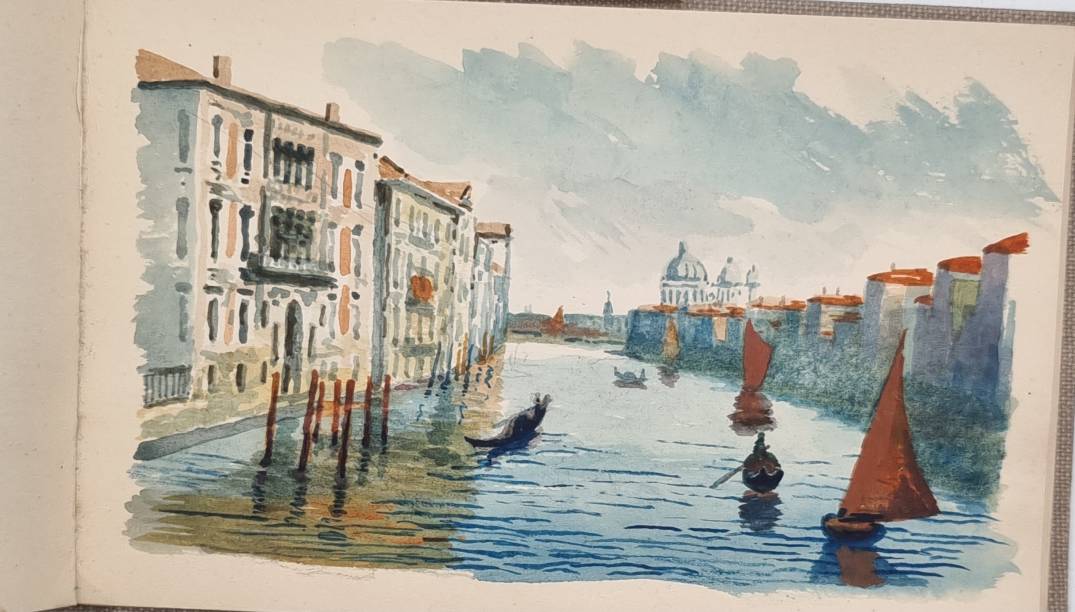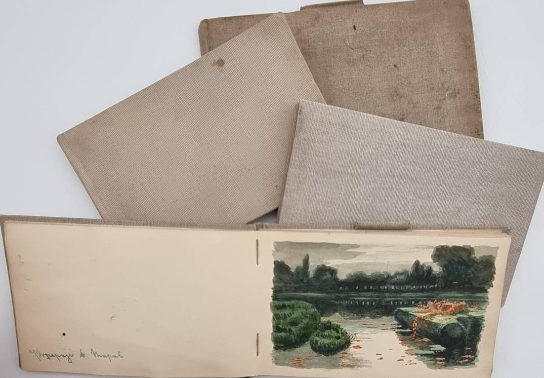 Leipoldt, Otto: Aus meinen Wanderungen. (3 Bände und ein Studienbuch). 4 Skizzenbücher einer Leipziger Künstlers. Mit mehr als 110 Aquarellen und Zeichnungen. 1869-1892. Querformat ca. 12 x 18,5 cm bzw. 12,5 x 20,5 cm. Graue Leineneinbände der Zeit. Auf den Innendeckeln mit Stempel „Otto Leipoldt Leipzig Sebastian Bach Str. 17“ und handschriftlichem Titel „Aus meinen Wanderungen“ sowie Datierung 1932. Das Einwohneradressbuch für Leipzig aus dem Jahr 1932 verzeichnet unter dieser Adresse einen „Otto Leipoldt“ mit der Berufsbezeichnung „Vertr[eter]. Die Bilder teils mit Datum versehen (1869-1892) und häufig mit Ortsangabe. Band I: Mit 27 Aquarellen u.a. London, Cornwall, Dartmouth, Rotterdam, Hamburg, München, Dillingen, St. Gotthart, Comer See, Lago Maggiore, Neapel; Band II: 30 Aquarelle u.a. „Mein Geburtshaus Rossmässlerstr. 8 (früher Waldstraße), Pleisenburg, Dresden, Görlitz, Alt Plauen, Burgstein, Werratal, Bremen, Meran, Hamburg, Holstein; Band III: Mit 26 Aquarellen, u.a.: Neapel, Rom, Florenz, Venedig; Band IV: Skizzenbuch: Mit ca. 30 Bleistiftzeichnungen mit Architektur- und Inndendekoration-Details sowie Kinderstudien und Schloß Ambras. Die Aquarelle sind von starker Farbigkeit und teils sehr stimmungsvoll.