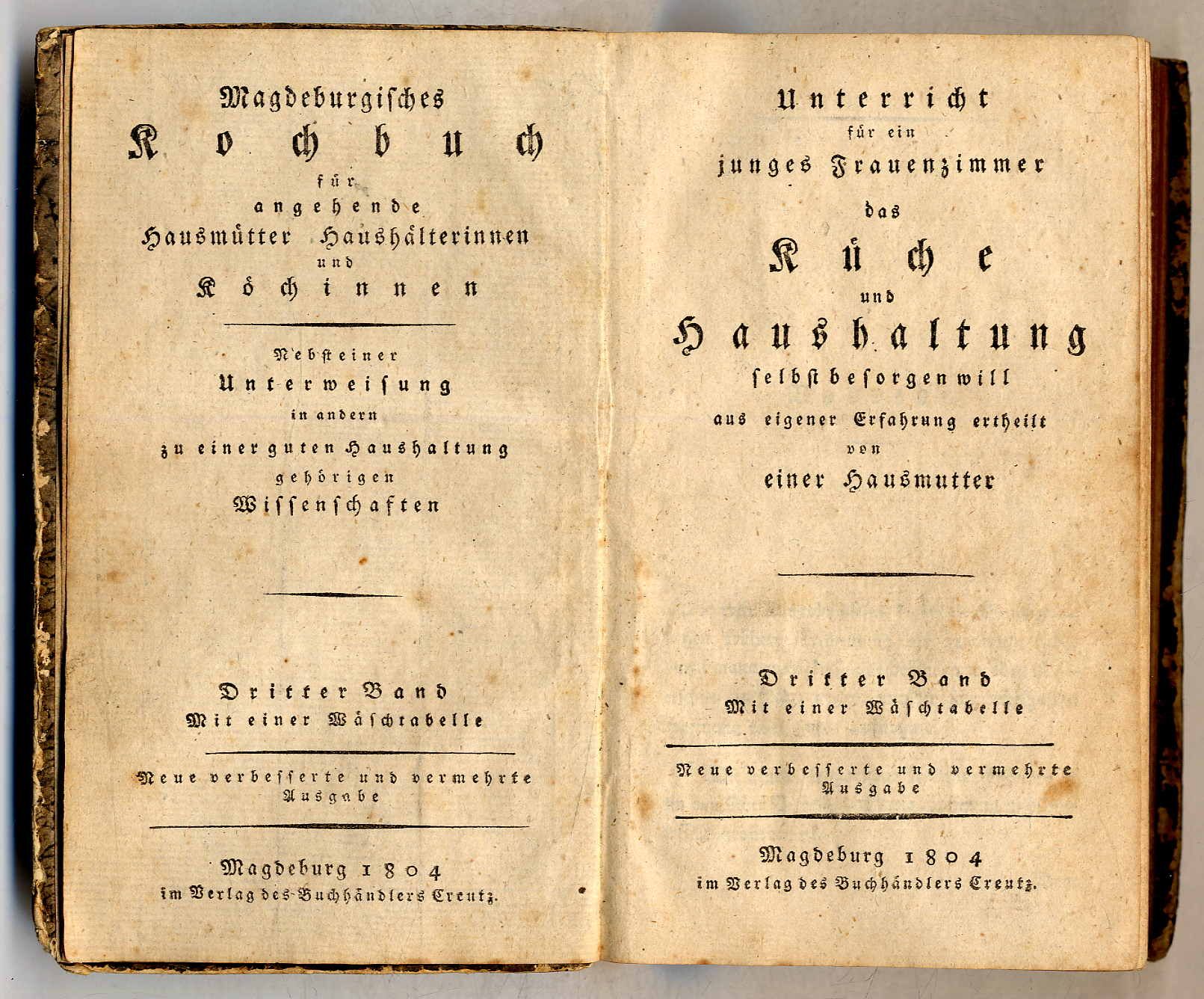 [Morgenstern-Schulze, Johanna Katharina]: Unterricht für ein junges Frauenzimmer, das Küche und Haushaltung selbst besorgen will, aus eigener Erfahrung ertheilt von einer Hausmutter. Neue verbessert und vermehrte Auflage. Magdeburg, Verlag des Buchhändlers Creutz, 1804. Ca. 17,5 x 10,5 cm. VIII S., 435 Seiten. Pappband der Zeit. 3. Band des Magdeburgischen Kokchbuchs für angehende Hausmütter, Haushälterinnen und Köchinnen. Weiss 2602. Band 3 der dreibändigen Ausgabe. Beinhaltet 760 Rezepte und Hilfsmittel, sowie Abteilungen vom Waschen, Selbst-Färben, vom Putzen und Verbessern und einem Anhang welcher die Zucht und Wartung des Federviehes und der Ziegen auf eine vortheilhafte Art einrichten und die Krankheiten dieser Thiere heilen kann; Nebst einer Abhandlung von den Krankheiten der Bienen und einem Bienenkalender. Einband stark bestoßen und beschabt, Seiten teils etwas stockfleckig. Die lose beigegebene Wäschetabelle fehlt.