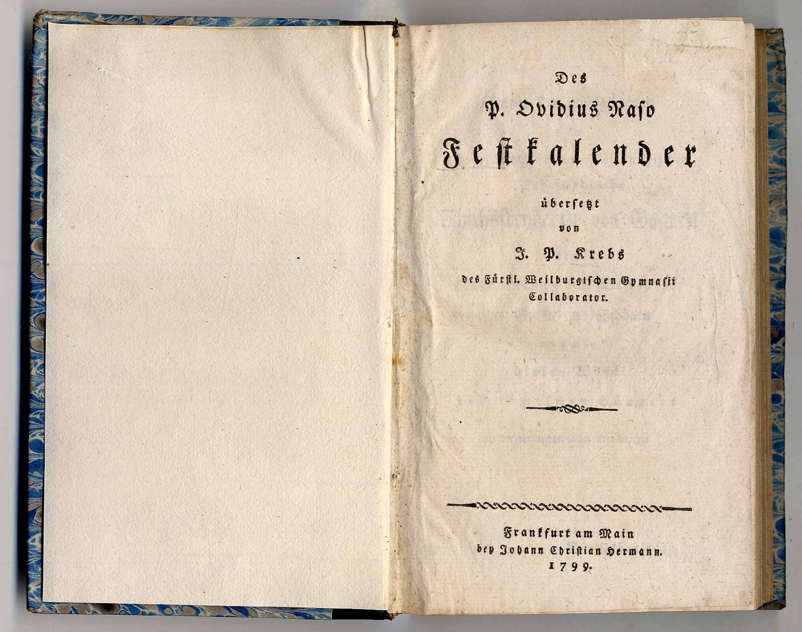 Ovid – Des P. Ovidius Naso Festkalender. Übersetzt von J[ohann] P[hilipp] Krebs. Frankfurt am Main, Johann Christian Hermann, 1799. Ca. 17,5 x 11 cm. XXXII S., 315 Seiten. Halbelderband (Deckel neu überzogen) mit geprägtem Rückenschild. Vorsätze erneuert. Seiten teils stockfleckig bzw. gebräunt. „Vollständig erscheinen hier zuerst die Fasi Ovids. Ein Unglücksstern traf dies Gedicht; denn nie wähle man es zum Lesebuch für Schulen, wozu es sich doch besser als des Dichters Klaglieder geeignet hätte …“ (Vorrede).