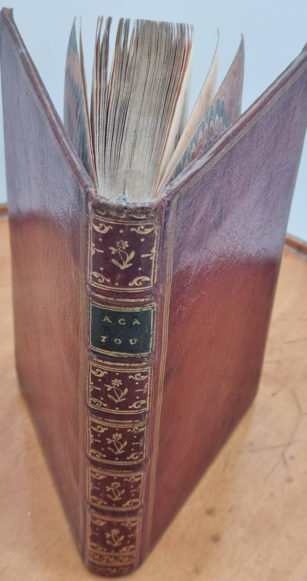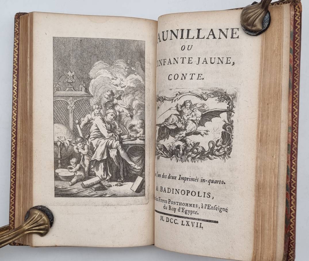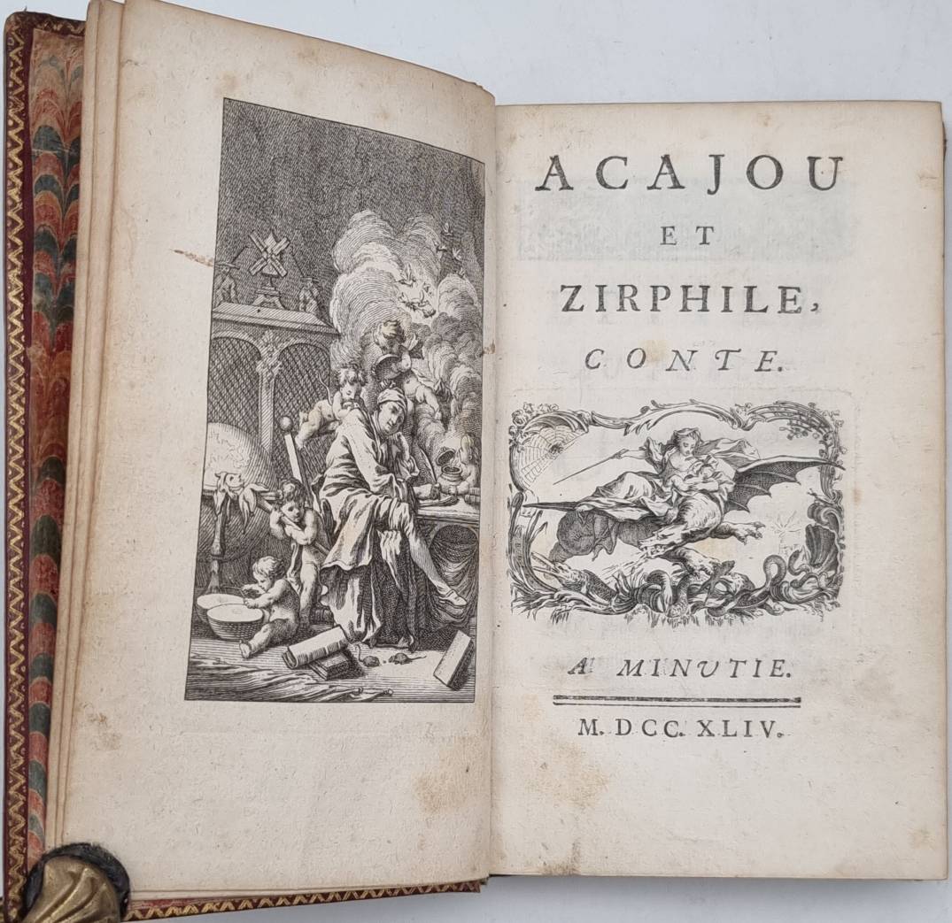[Duclos, Charles Pinot]: Acajou et Zirphile, conte. Beigebunden: [Carl Gustav de Tessin]: Faunillane ou l’infante jaune, conte. A Minutie. (d.i. Paris), [Prault], 1744. Ca. 16 x 10 cm. Sowie: A Badinopolis (d.i. Paris), chez les Freres Ponthommes, à L’Enseigne du Roy d’Egypte. (16) S., 161 Seiten, mit gestochenem Frontispiz, Titelvignette sowie 9 Kupferstichtafeln; (4) S., 48 Seiten, mit gestochenem Frontispiz, Titelvingette sowie 9 Kupferstichtafeln. Roder Ganzledereinband mit Deckelfileten und Innenkantenvergoldung. Goldschnitt. Seiten teils leicht fleckig, einige Seiten am Rand etwas wasserrandig. Interessante Zusammenführung: François Boucher fertige ursprünglich um 1740 die Zeichnungen für Faunillane ou l’infante …, das in nur wenigen Ausgaben erschien. Die Abbildungen wurden dem Verleger Prault gegeben, der daraufhin bei Duclos eine Erzählung in Auftrag gab, um die Kupferstiche dann im Band Acajou et Zirphile erneut wiederzugeben. Text auf französisch.