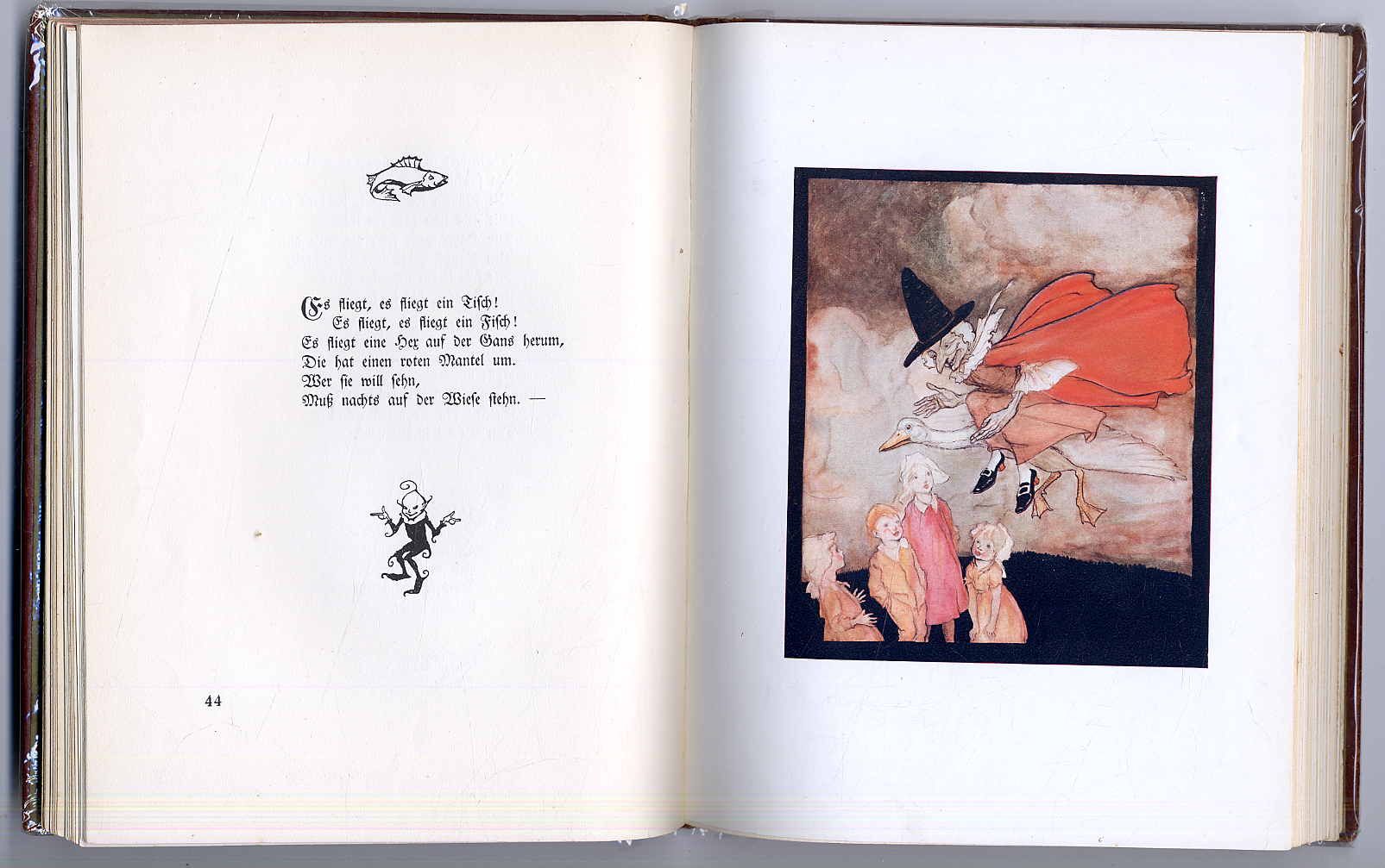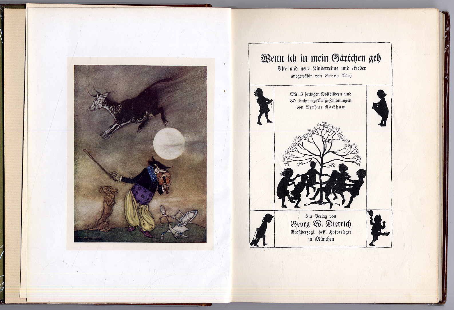 Max, Stora: Wenn ich in mein Gärtchen geh. Alte und neue Kinderreime und -Lieder. München, Georg W. Dietrich, [1924]. Ca. 23 x 17,5 cm. 147 S. Mit 13 farbigen Vollbildern und 80 Schwarz-Weiß-Zeichnungen von Arthur Rackham. Roter Orig.-Leinenband mit Goldprägung. Klotz 4499/5. Der englische Maler und Illustrator Rackham (1867-1939) war Mitglied der Royal Water Colour Society und aktiv in der Art Worker’s Guild. 1919 erhielt er in London ein Studio bis an sein Lebensende. „Der Umstand, für eine solch auswahlreiche Sammlung einen so vorzüglichen Illustrator wie Arthur Rackham gewinnen zu können, veranlaßte mich zur Übergabe an die Oeffentlichkeit, zumal eine derartige Sammlung bisher in keiner Ausgabe erschienen ist. (Vorwort). Einband etwas berieben. Mit Exlibris.