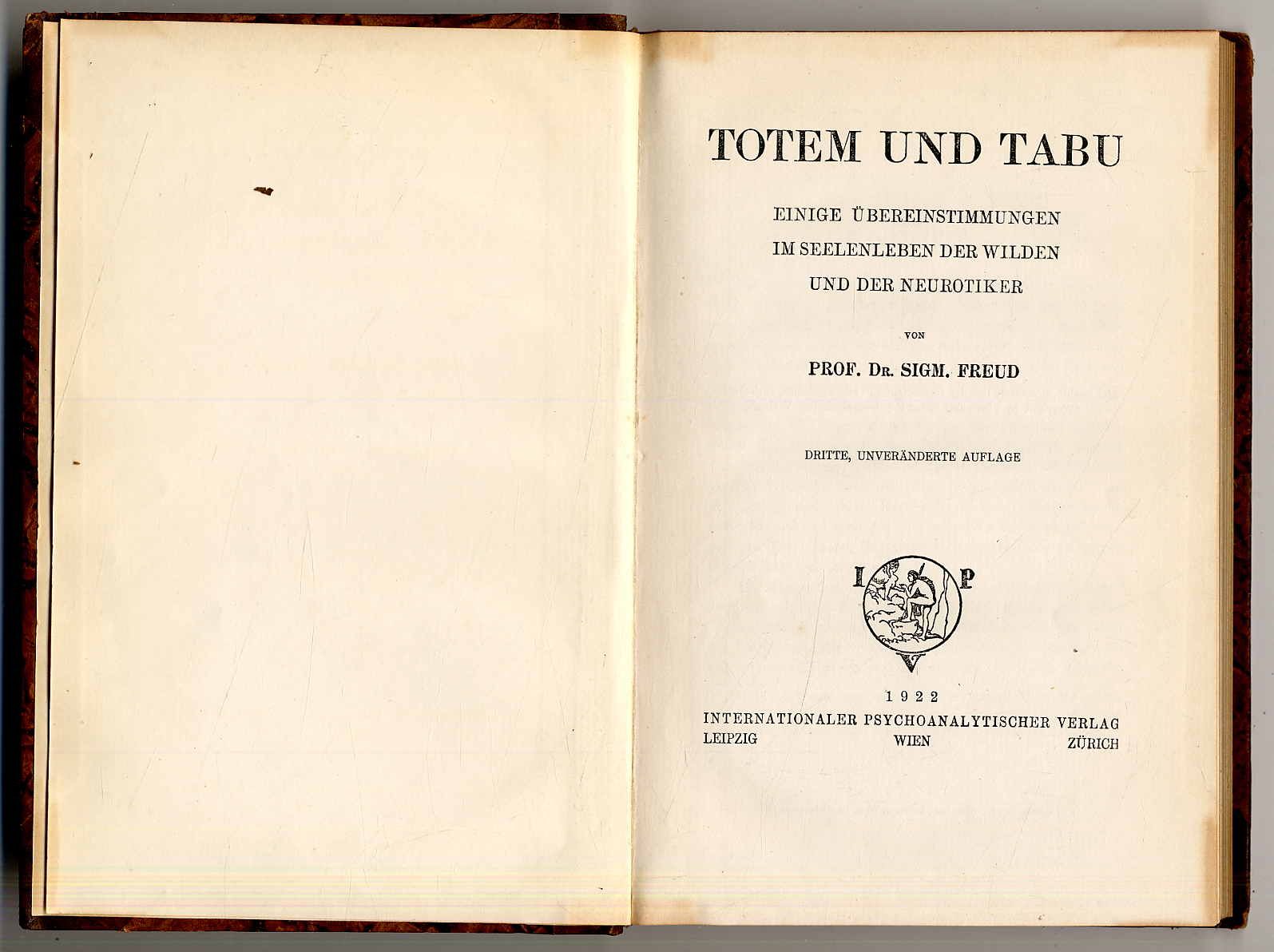 Freud, Sigmund: Totem und Tabu. Einige Übereinstimmungen im Seelenleben der Wilden und der Neurotiker. 3. unveränderte Auflage. Leipzig u.a., Internationaler Psychoanalytischer Verlag, 1922. Ca. 23 x 15,5 cm. VI S., (3) S., 216 Seiten. Halblederband der Zeit mit geprägtem Rückenschild. Aus dem Inhalt: Die Inzestscheu; Das Tabu und die Ambivalenz der Gefühlsregungen; Animismus, Magie und Allmacht der Gedanken; Die infantile Wiederkehr des Totemismus. Kleiner Namenszug auf Vorsatz. Seitenränder minimal gebräunt.