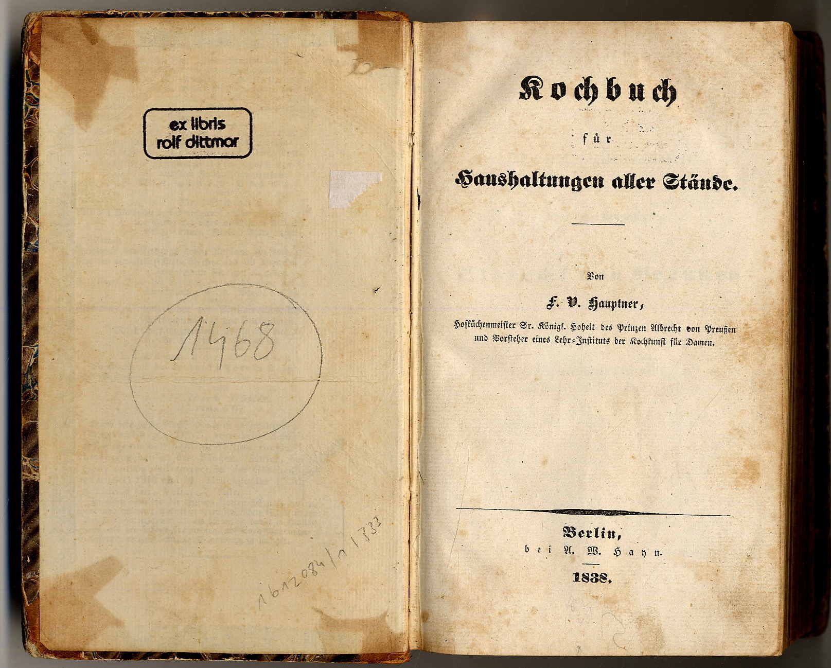 Hauptner, F[erdinand] V[alentin]: Kochbuch für Haushaltungen aller Stände. Berlin, A.W. Hayn, 1838. Ca. 20,5 x 12,5 cm. XII S., 863 Seiten. Halblederband der Zeit. Erste Auflage. Alicke 3192; Horn/Arndt 464; Weiss 1479 (jeweils verschiedene Auflagen). Einband berieben, Kanten und Rücken stärker bestoßen bzw. beschabt. Innendeckel mit Stempel eines Vorbesitzers. Seiten teils etwas stockfleckig. Einige Blätter mit Wurmspuren im unteren weißen Rand. Der Autor war Hofküchenmeister beim Prinzen Albrecht von Preußen und Vorsteher eines Lehr-Institus der Kochkunst für Damen. Einband minimal berieben. „Lachs in Papierkästchen: Bestreiche den Boden kleiner Papierkästchen mit einem leichten Farce von Fischen, welcher mit fein gehackten Kräutern, als z.B. Petersilie, Estragon, Chalotten u.s.w., vermischt ist, wie einen Federkiel dick, lege eine Scheibe geräucherten, guten Rheinlachs darauf, bestreiche diese oben gleichfalls mit dem Farce von Fischen, streue alsdann geriebenen Parmesankäse darauf, beträufele diesen mit Krebsbutter, und lasse dies im Ofen backen.“