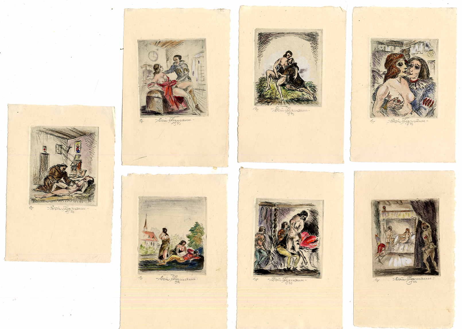 Theermann, 7 erotische handcolorierte Radierungen von Erwin Theermann.