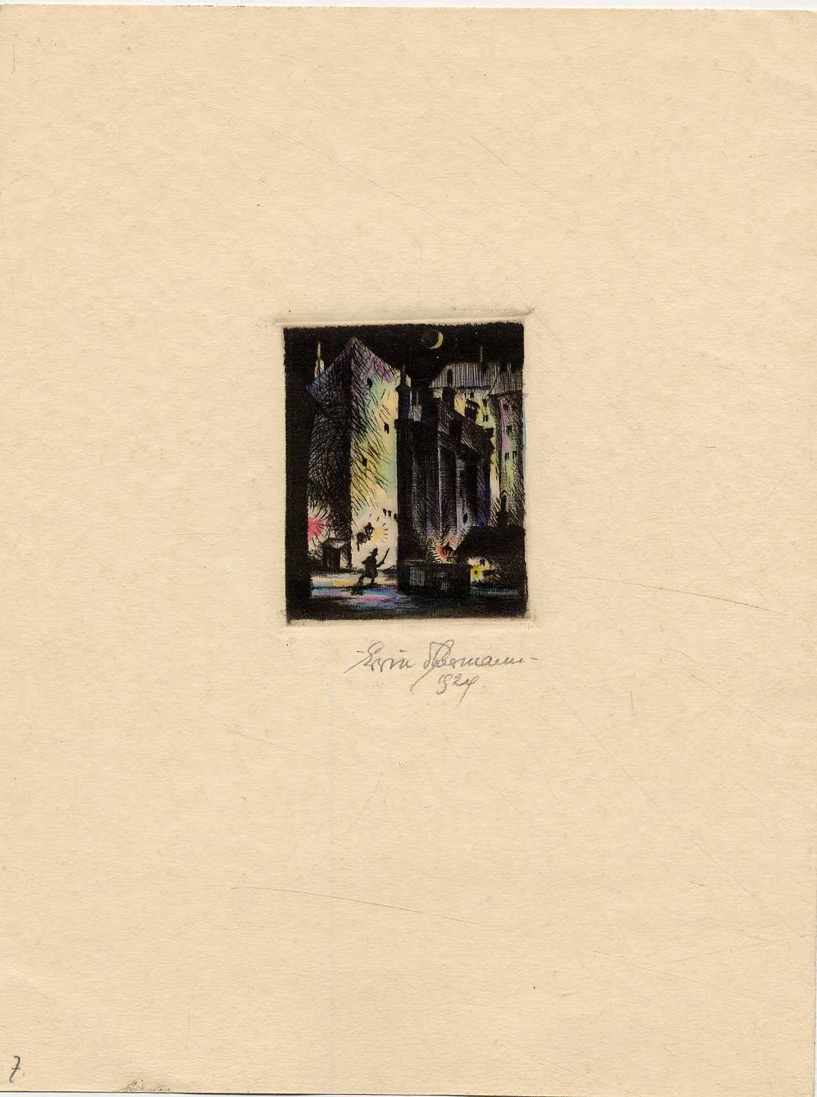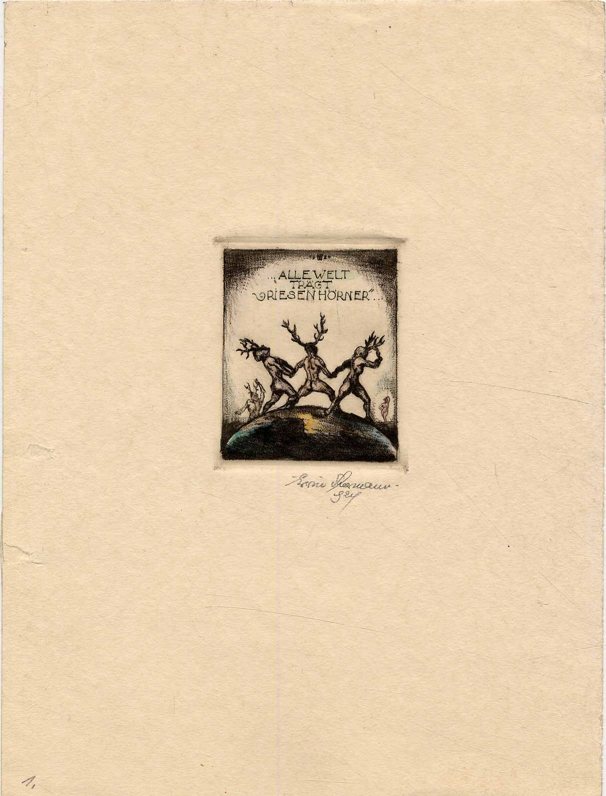 Theermann, Erwin: Alle Welt trägt Riesenhörner. 7 handcolorierte Originalradierungen von Erwin Theermann. 1924. Blattgröße ca. 19,5 x 15 cm. Jeweils handschriftlich vom Künstler signiert und datiert. 7 Original-Radierungen, (Radierungen ca. 6 x 5 cm). Vermutlich fehlt die Radierung Nr. 3 (die Blattnummerierung endet bei 8). Erwin Theermann (1905-1927) ging als junger Mann nach München, um sich dort der Kunstgeschichte und dem Studium der Künste zu widmen. Schon als Jugendlicher hatte er sich der Grafik gewidmet. Beigefügt: Eine handcolorierte Radierung (Mönch mit nackter Frau), in der Platte mit „Balzac“ bezeichnet von ET monogrammiert.