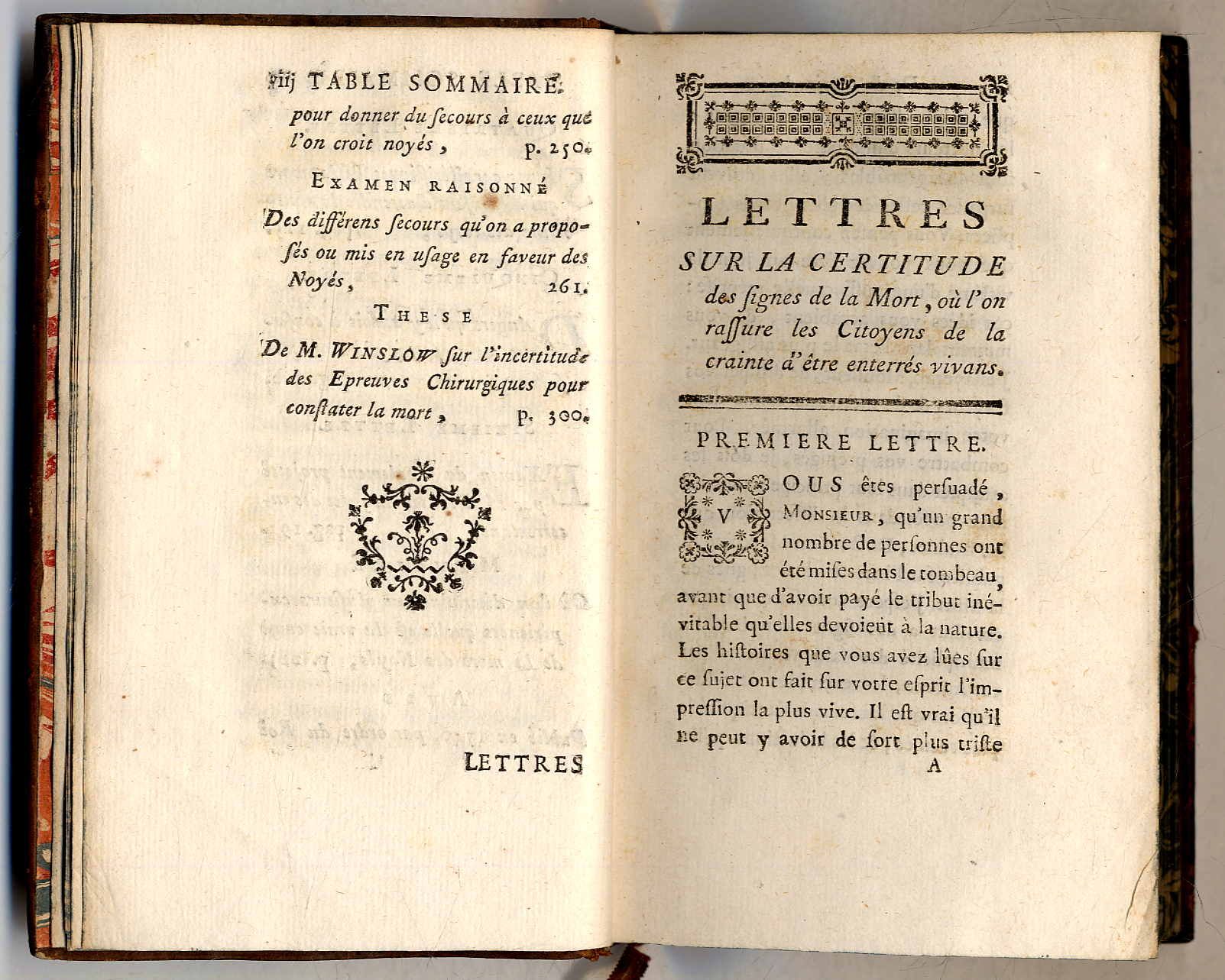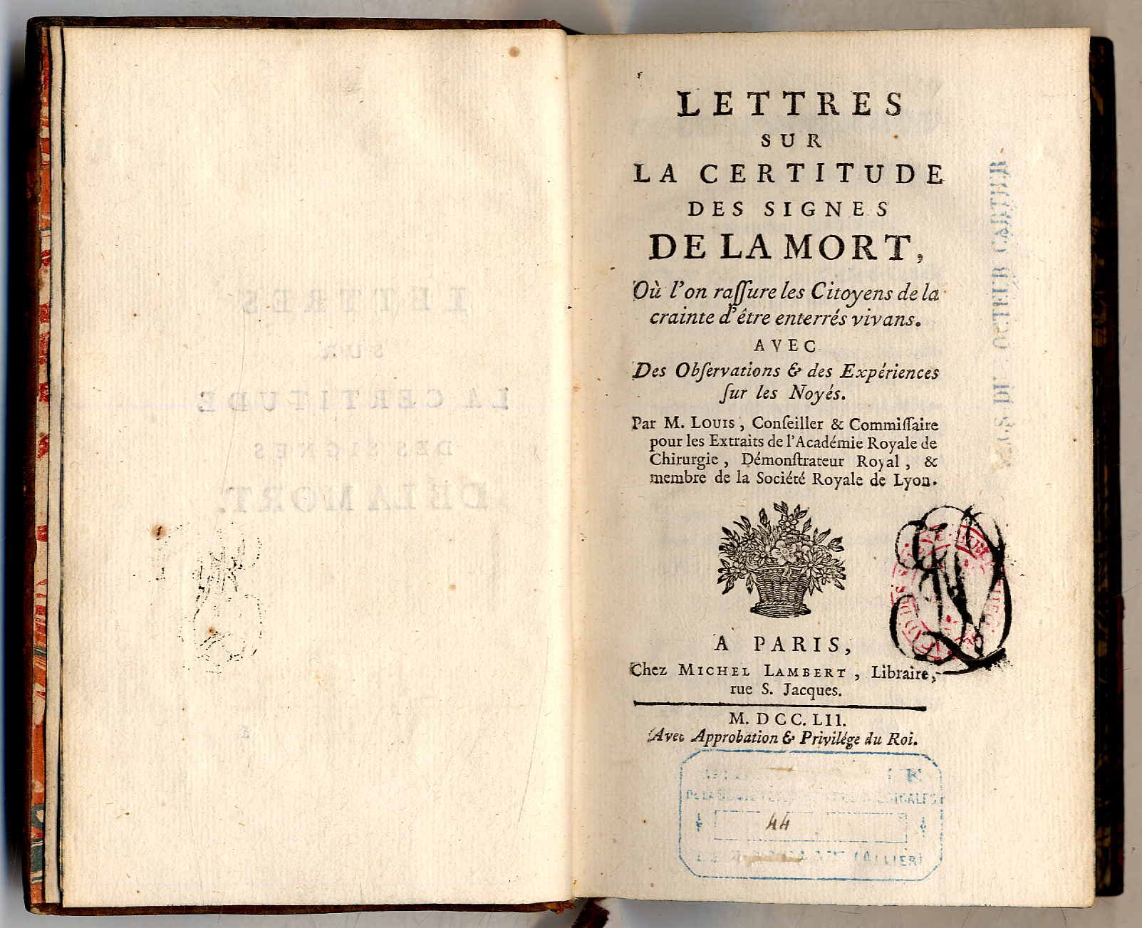 Louis, [Antoine]: Lettres sur la certitude des signes de la mort, Où l’on rassure les citoyens de la crainte d’ étre enterrés vivans. Avec des observations & des expériences sur les noyés. Paris, Michael Lambert, 1752. Ca. 16,5 x 10 cm. VIII S., 376 S., (8) Seiten. Mit einer Kupferstich-Tafel. Ledereinband der Zeit mit Rückenschild und Rückengoldprägung. Titelblatt mit Resten alter Besitzstempel und mit zwei kleinen Fehlstellen, sonst gutes Exemplar. Text auf französisch. Erste Ausgabe der Abhandlung über die sicheren Todesanzeigen, ein Thema, das im 18. Jahrhundert in einer großen Anzahl von Schriften abgehandelt wurde. Verfaßt von A. Louis (1723-1792), einem der bekanntesten französischen Mediziner. Er beschreibt u.a. die „Todeszeichen“ und benennt jene, die er für unfehlbar hält: die Totenstarre und die Schlaffheit des Auges – ein Abwarten der Fäulnis sei nicht nötig und zudem aus hygienischer Sicht gefährlich. Ausführlich auch (hierzu auch die Kupfertafel), wie mithilfe von Rauch, der in den Anus eingeblasen wird (entweder mit dem auf der Tafel gezeigten „Tabak-Beatmungsgerät“ oder notfalls mit einem Pfeifenröhrchen) Ertrunkene wieder zum Leben erweckt wurden. Der eingeblasene Rauch sollte das Opfer erwärmen und seine Atmung stimulieren.
