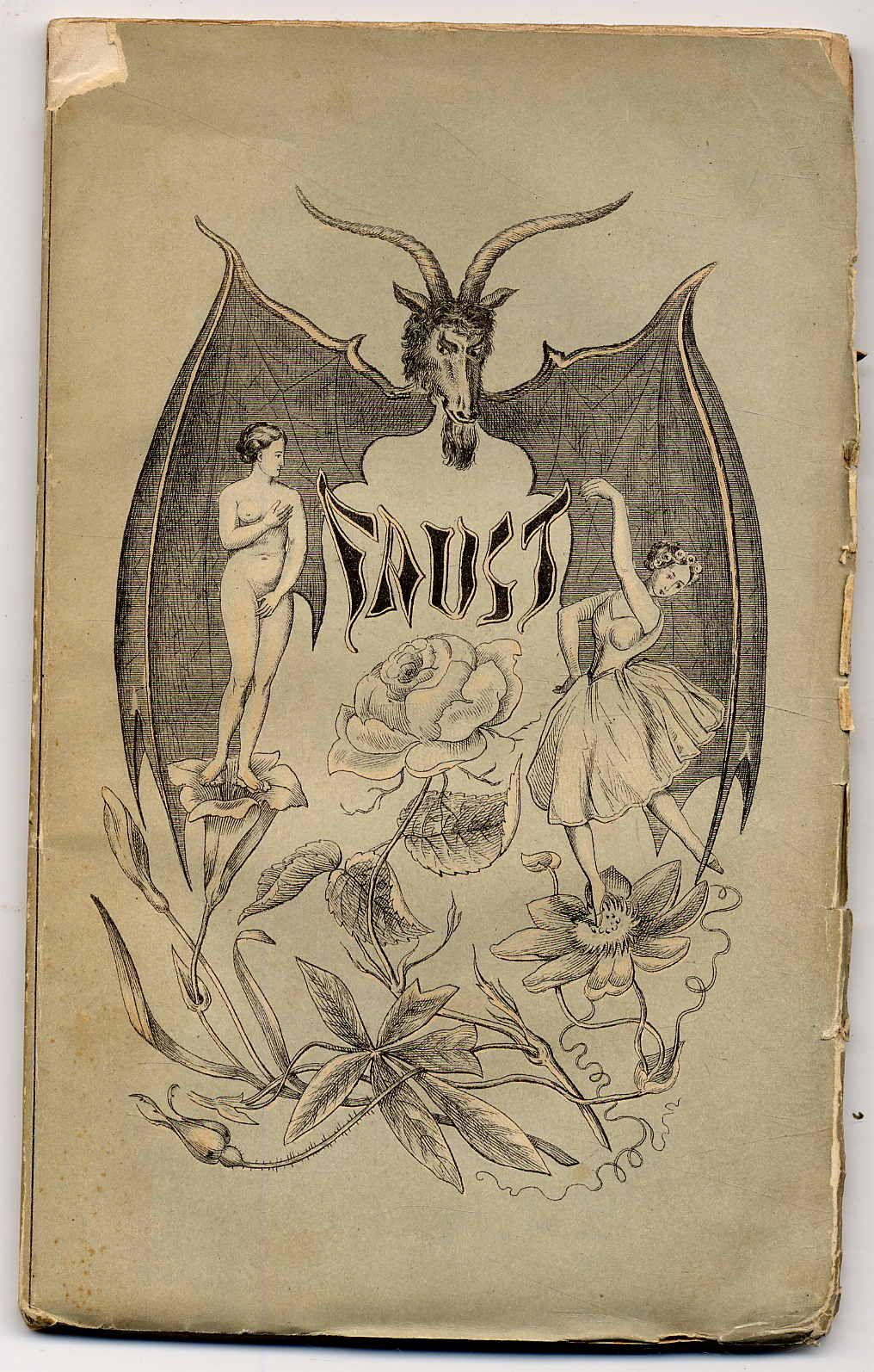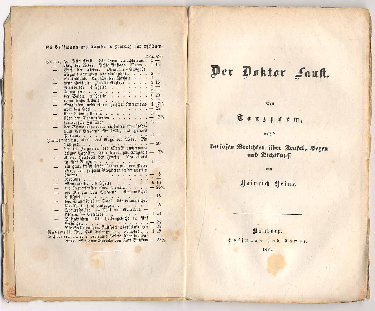 Heine, Heinrich: Der Doktor Faust. Ein Tanzpoem, nebst kuriosen berichten über Teufel, Hexen und Dichtkunst. Hamburg, Hoffmann und Campe, 1851. Ca. 19 x 11,5 cm. 103 Seiten. Illustrierte Originalbroschur. Erste Ausgabe. WG 22. Unbeschnittenes, breitrandiges Exemplar. Einband angerändert und mit kleineren Fehlstellen am Rand und zum Rücken hin.