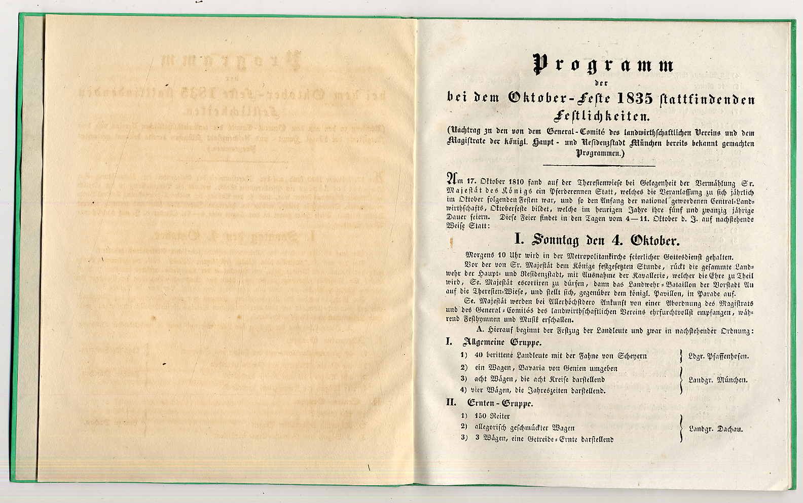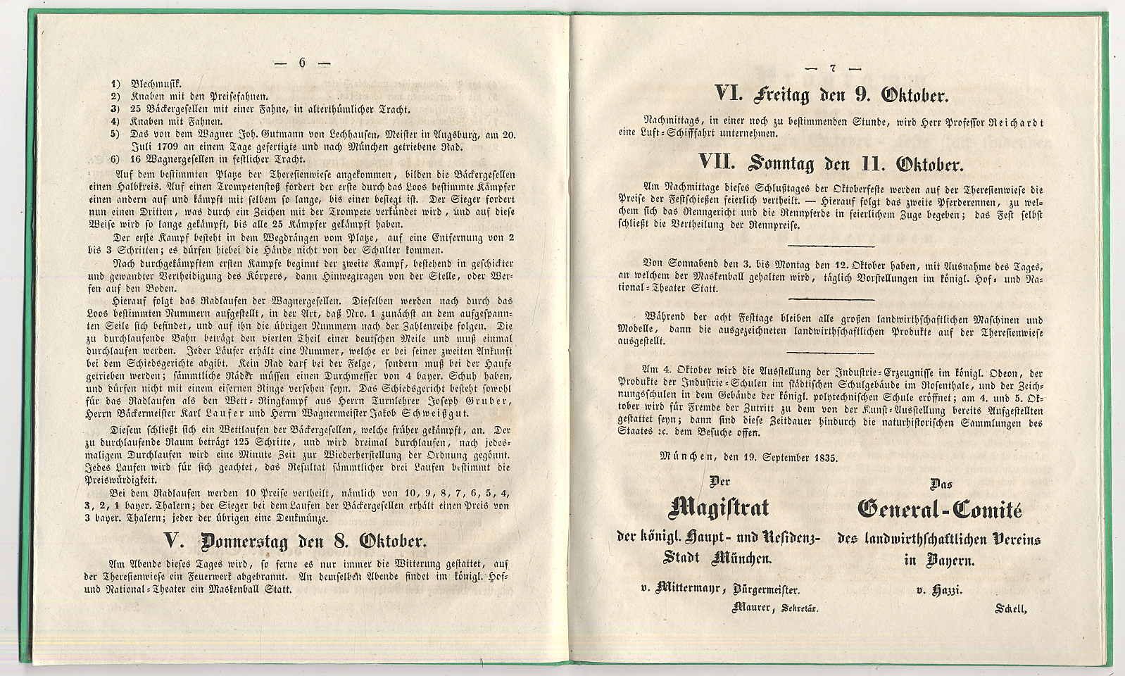 Oktoberfest – Programm der bei dem Oktober-Feste 1835 stattfindenden Festlichkeiten. (Nachtrag zu den von dem General-Comité des landwirthschafltichen Vereins und dem Magistrate der königl. Haupt- und Residenzstadt München bereits bekannt gemachten Programmen). Beigebunden: Programm über die während der heurigen Oktober-Feste statt findenden Pferderennten und Fest-Schießen. München, 1835. Ca. 22 x 18 cm. 7 Seiten; 7 Seiten. Grüner Pappband der Zeit mit Goldprägung. Zu Ehren der Silberhochzeit von König Ludwig I. von Bayern und Prinzessin Therese fand 1835 erstmals ein Trachtenumzug statt. Die Wägen stellten in lebenden Bildern allegorische und Alltags-Szenen nach, z.B. Bavaria von Genien umgeben; Jahreszeiten, Getreide-Ernte; Obstbau; Hopfen-Ernte; Schafzucht; Heuernte; Gebirgsschützen; Floßfahrt; Gebirgstrachten; Fischerei; Mövenjagd am Seefelder See; Kirchweihe; Hochzeit; Landleute aus der Würmsee-Gegend; Wappen- und Waffenschmuck; Gartenbau, zimmerleute, Maurer; städische Lebensverhältnisse. Gutes Exemplar. Seltens Programmheft.