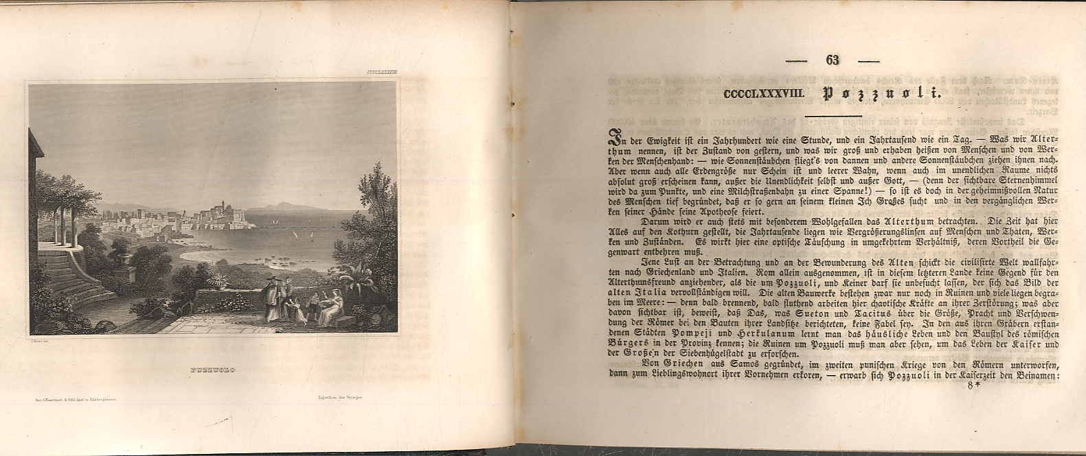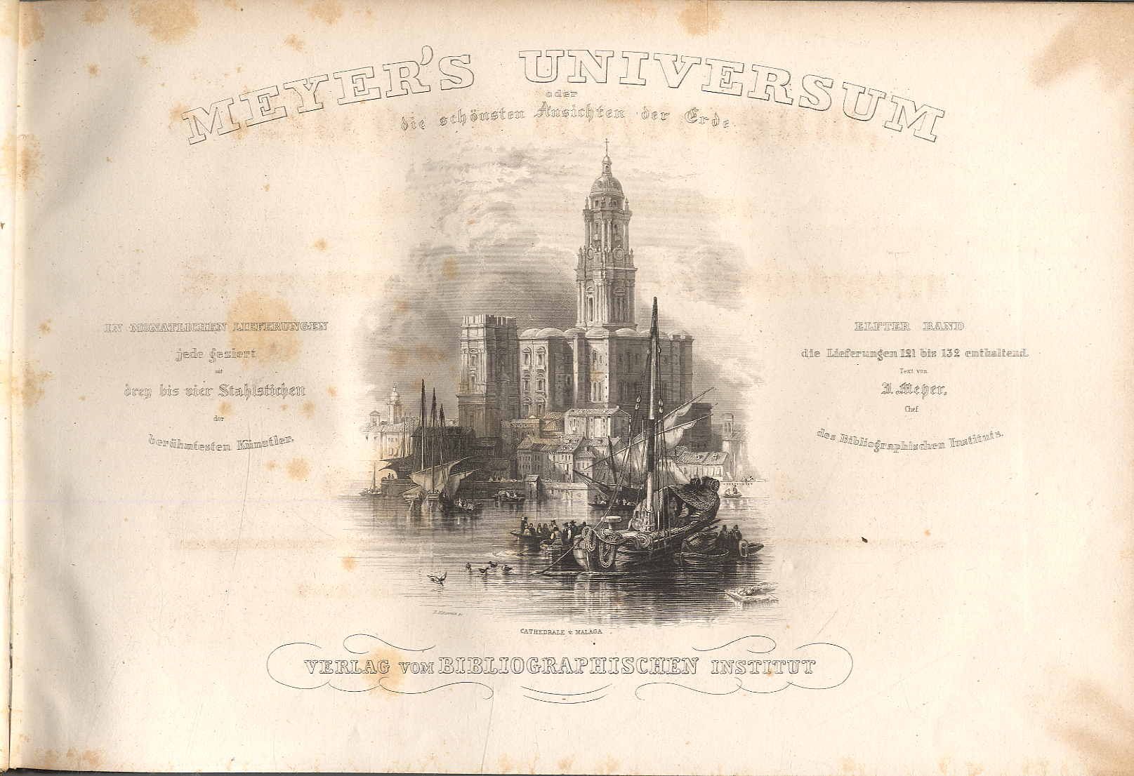 Meyer’s Universum, oder Abbildung und Beschreibung des Sehenswerthesten und Merkwürdigsten der Natur und Kunst auf der ganzen Erde. 11. Band und 12. Band. In einem Band gebunden. Hildburghausen u.a., Bibliographisches Institut, 1844-1847. Querformat, ca. 19 x 27 cm. 166 S., (2) Seiten, mit 48 Stahlstichtafeln; 186 Seiten, mit 48 Stahlstichtafeln. Halblederband der Zeit mit Rückenschild. Rücken bestoßen. Namenszug auf Vorsatz. Seiten und Tafeln teils etwas stockfleckig, Tafeln teils gebräunt durch Abklatsch der gegenüberliegenden Seite. Ansichten u.a. von: Börse in Paris, Zürich, das Reußthal, Bangor in Wales, Neuchatel, Dublin, Hannover, Straßburg, Birmingham, Janina in Albanien, Barcelona, Karavanserai in Skutari, Ausstellungs-Palast für Industrie und Kunst in München, Basel, Homburg v.d. Höhe Kurhaus, Genf, Buenos-Ayres, Dom zu Magdeburg, Leipziger Markt.