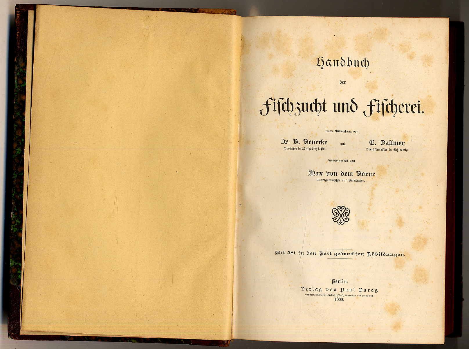 Borne, Max v.d.: Handbuch der Fischzucht und Fischerei. Berlin, Paul Parey Vlg., 1886. Ca. 22,5 x 15 cm. XIII S., 701 Seiten. Mit 581 in den Text gedruckten Holzschnittabbildungen. Halblederband der Zeit. Rücken und Kanten etwas berieben. Titelblatt und die ersten Seiten stockfleckig, sonst gutes Exemplar.