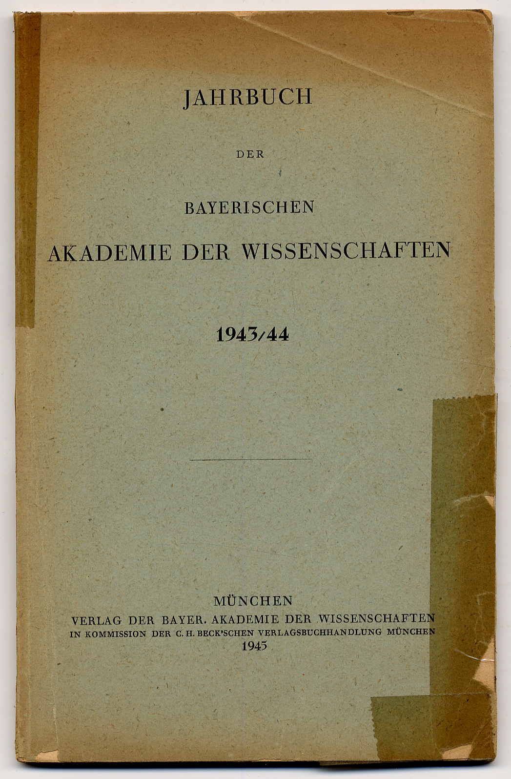 Jahrbuch der Bayerischen Akademie der Wissenschaften. München, Vlg. der Bayer. Akademie der Wissenschaften, 1945. 2214 81 Seiten. Originalkartonierter Einband. Einband Einrisse und Randfehlstelle mit altem Tesafilm geklebt. Einband und Seitenränder papierbedingt gebräunt und mit kleinen Randeinrissen. „Beim Fliegerangriff auf die innere Stadt in der Nacht zum 24. April 1944 wurde das bereits im Herbst 1943 leicht beschädigte historische Akademiegebäude an der Neuhauser Straße … von zahlreichen Brandbomben und Phosphorkanistern getroffen und brannte bis auf den Grund ab. Fast die ganze Einrichtung, ein Teil der Bibliothek und die Hauptbestände an akademischen Schriften … sind dabei mit vielem anderen wertvollen Kulturgut der Akademie verloren gegangen.“ (S. 1). Enthält u.a. einen Bericht über die Arbeiten am Mittellateinischen Wörterbuch (und erwähnt die Gerfährdung der Arbeitsstelle), Bericht der Kommission für Mundartforschung, führt den Personenstand auf und berichtet über die Arbeit am Thesaurus linguae Latinae.
