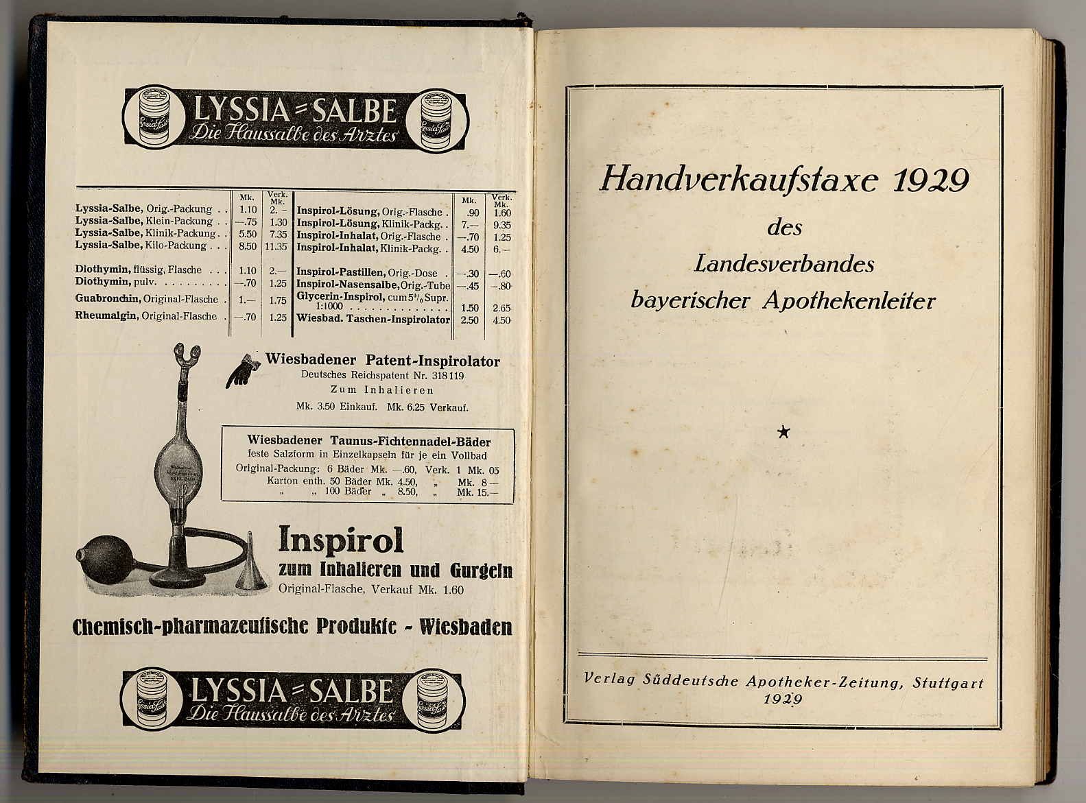 Handverkaufstaxe 1929 des Landesverbandes bayerischer Apothekenleiter. Stuttgart, Verlag Süddeutsche Apotheker-Zeitung, 1929. Ca. 23,5 x 15,5 cm. 6 S., 116 S., 44 Seiten Werbung. Halblederband der Zeit. Durchschossenes Exemplar, d.h., nach jedem Blatt ist ein weißes, unbedrucktes Blatt für eigene Notizen eingebunden. Listet die Verkaufs-, Rezeptur-, Einkaufspreise auf. Einband und Titelblatt minimal fleckig, jedoch gutes Exemplar.