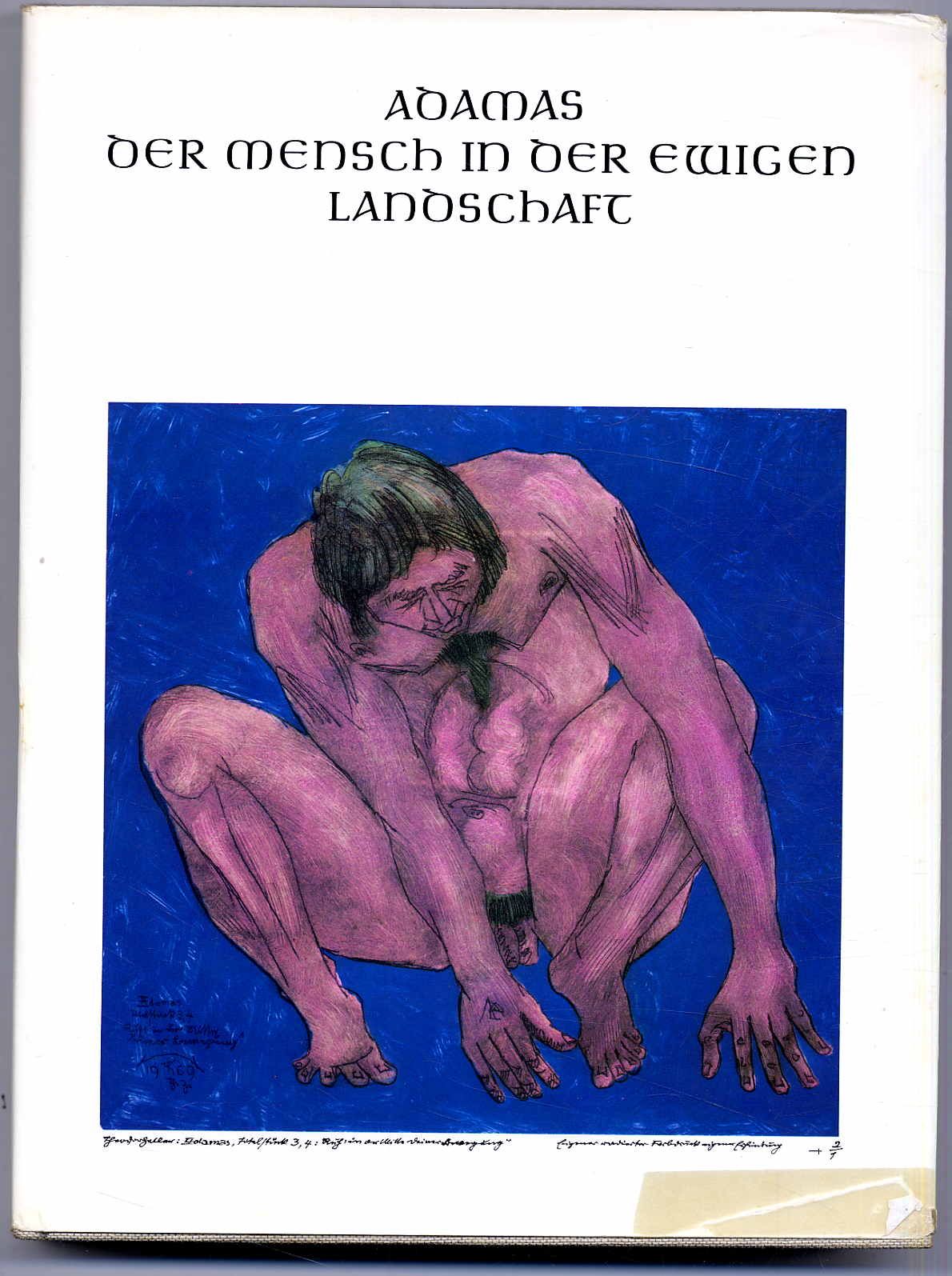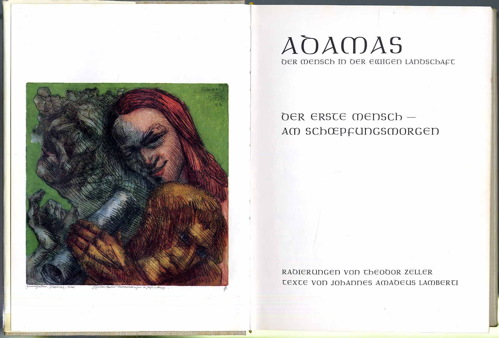 Lamberti, Johannes Amadeus: Adamas. Der Mensch in der ewigen Landschaft. Der erste Mensch – Am Schopfungsmorgen. Freiburg u.a., Verlag Der Mensch, 1970. Ca. 28 x 21 cm. 322 S., (2) Seiten. Mit zahlreichen meist farbigen Bildern nach Radierungen von Theodor Zeller. Grauer Orig.-Leinenband mit Schutzumschlag (dieser am unteren Rand mit Tesafilm geklebt). Letztes Blatt und Schnitt minimal fleckig, sonst gutes Exemplar.