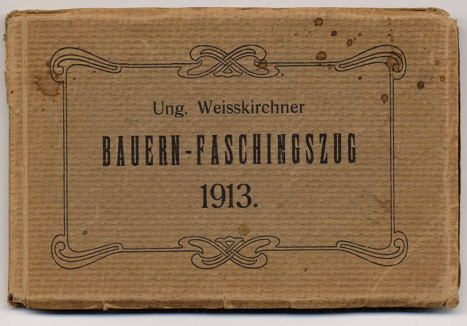 Ung. Weisskirchner Bauern-Faschingszug 1913. Fehértemplon (Weisskirchen), Harkanyi, 1913. Querformat, ca. 11,5 x 18 cm. 25 fotografische Abbildungen. Originalkartonierter Einband. Zeigt u.a. Umzugswagen und Teilnehmer: Fanfarenbläser, Banderium junger Bauern, Banderium amerikanischer Farmer, Jäger-Banderium, Musikwagen, Faschingszeit, Osterzeit, Pfingstzeit, Kirchweihzeit, Reisezeit Touristengruppe, Reisezeit Spielbank von Monte Carlo, Reisezeit Titanic, Reisezeit Rettungsboot Karpatia, Winterzeit der preisgekrönten Füchsenfänger von Ung. Weisskirchen, Friedenskonferenz in London, Chinesische Spazierfahrt, Storchgruppe sowie eine Innenansicht des Fotoateliers Harkányi. Einband leicht fleckig und mit kleinen Einrissen, jedoch gutes Exemplar dieses seltenen Albums.
