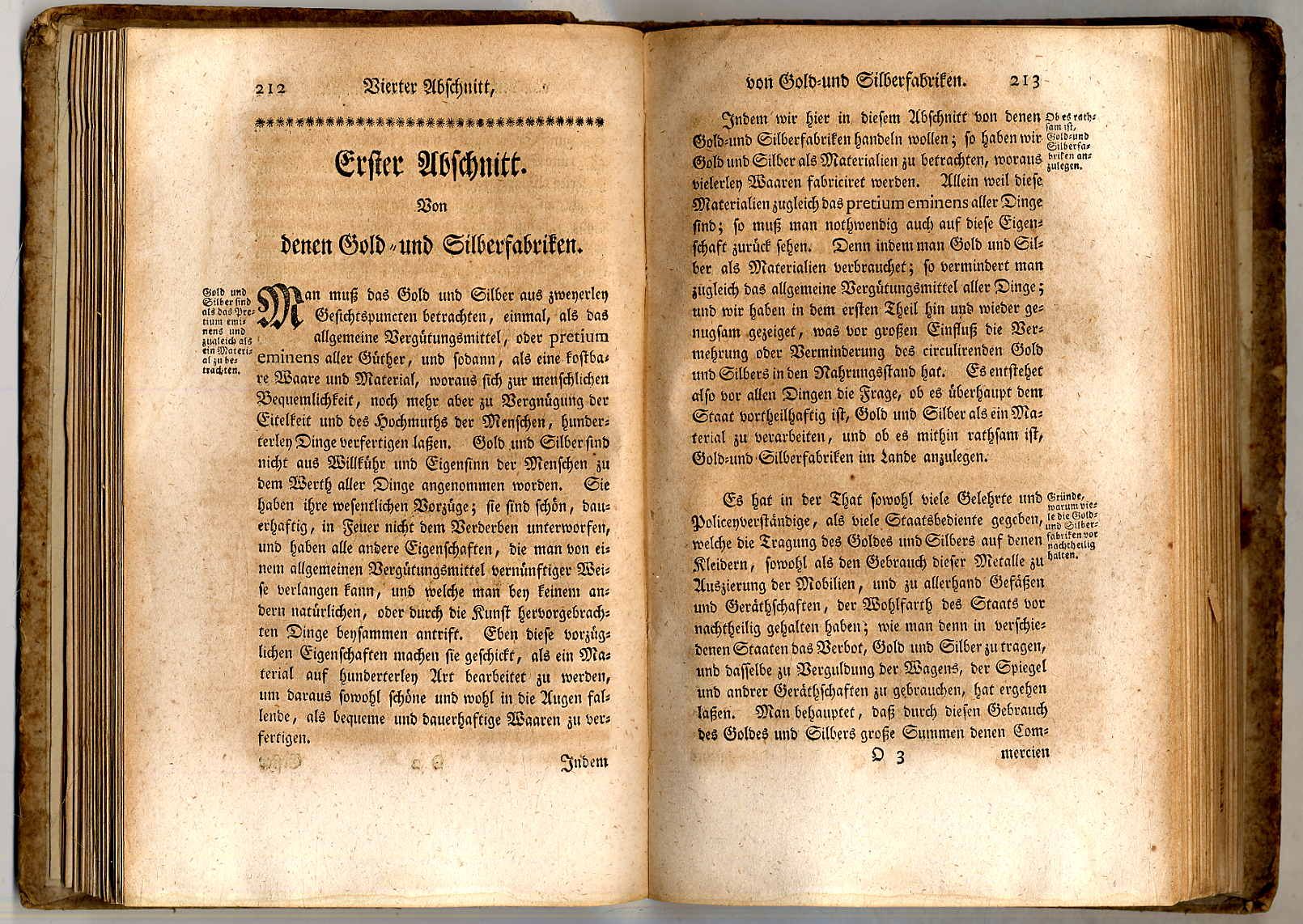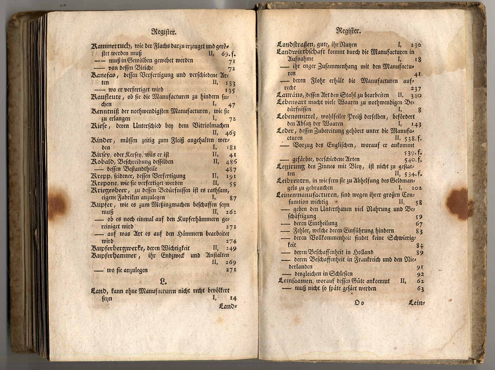 Justi, Johann Heinrich Gottlob v.: Vollständige Abhandlung von denen Manufacturen und Fabriken. Zweyter Theil, welcher alle einzelne Manufacturen und fabriken nach der Eintheilung ihrer Materialien abhandelt. Koppenhagen, Rothensche Buchhandlung, 1761. Ca. 21 x 13,5 cm. (16) S., 562 S., (30) Seiten Register. Einfacher Pappband der Zeit. Einband stark fleckig. Seiten gebräunt, teils stockfleckig bzw. wasserrandig. Einige Seiten am Schluss mit braunem Fleck am Rand. Der erste (hier nicht vorliegende) Band erschien 1758. Aus dem Inhalt u.a.: Wollenmanufacturen, Tuchmanufacturen, Zeugmannmanufacturen, Leinenmanufacturen, Leinewandmanufacturen, Seidenmanufacturen, Gold- und Silberfabriken, Drahtziehern und dergleichen Fabricaturen, Kupfer- und Meßinghämmern, Stück- und Glockengießereyen, Eisenhütten und Eisengießereyen, Staab- und Blechhämmern, von den ächten Porcelanfabriken, von unächten Porcelanfabriken, Glasfabriken, Alaun- und Vitriolsiedereyen, Blaufarbenwerken, Zinnober- und Sublimatfabriken, von Bleyweiß, Mennige, Grünspan etc., Papier und andern Fabricaturen.
