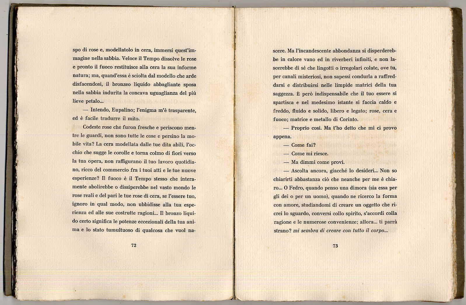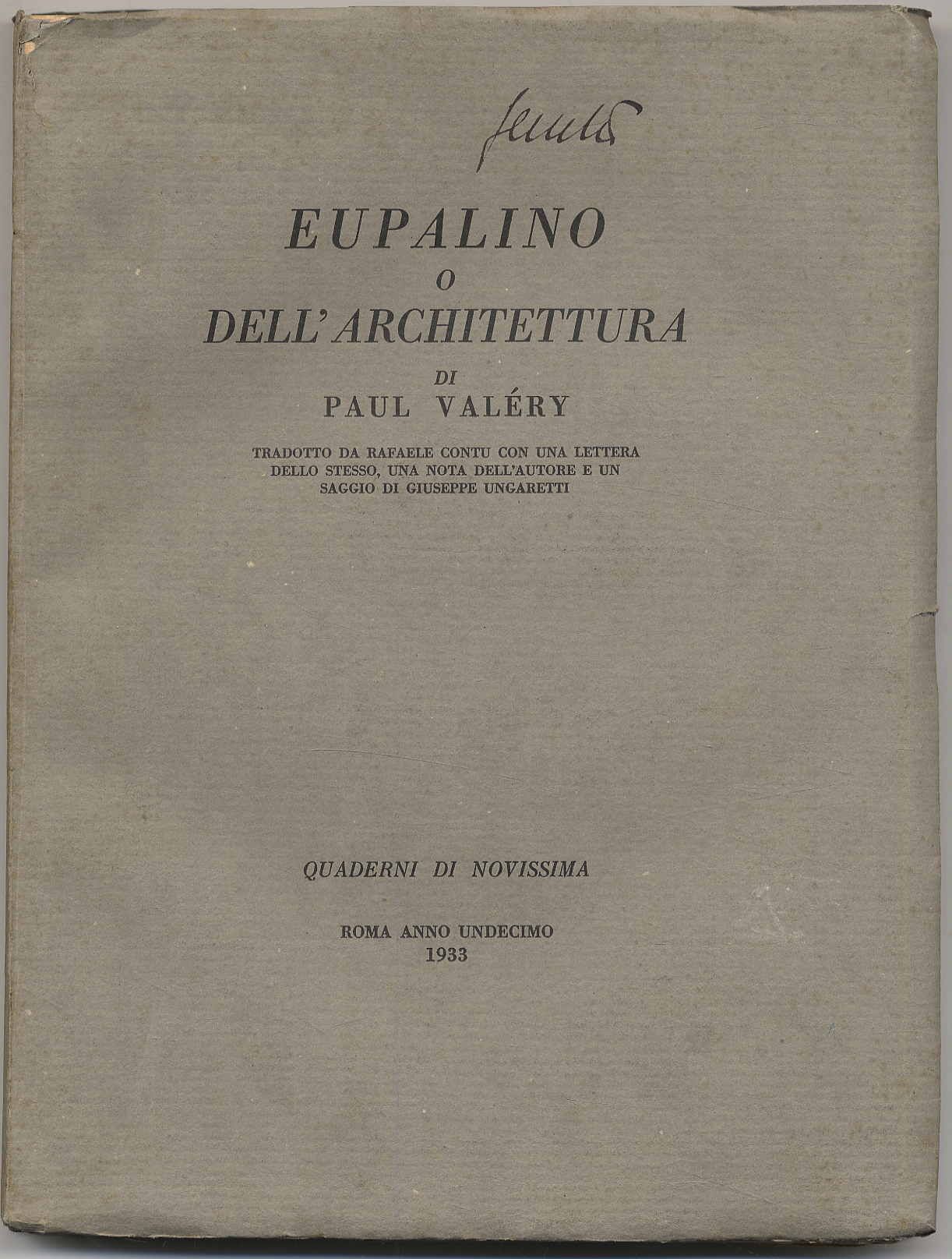 Valéry, Paul: Eupalino, o dell’architettura, tradotto da Rafaele Contu, con una lettera dello stesso, una nota dell’autore e un saggio di Giuseppe Ungaretti. Roma, 1933. Ca. 26 x 19,5 cm. 167 Seiten. Orig.-Broschur. Quaderni di Novissima, Vol. IX. Ex. 13/110 Ex. auf „Sirio“-Papier (Gesamtaufl. 160). Einband mit kleineren Randeinrissen. Seiten teils etwas stockfleckig. Widmung auf Vorsatz und Name auf Einband. Unaufgeschnittenes und unbeschnittenes, breitrandiges Exemplar. Text auf Italienisch.