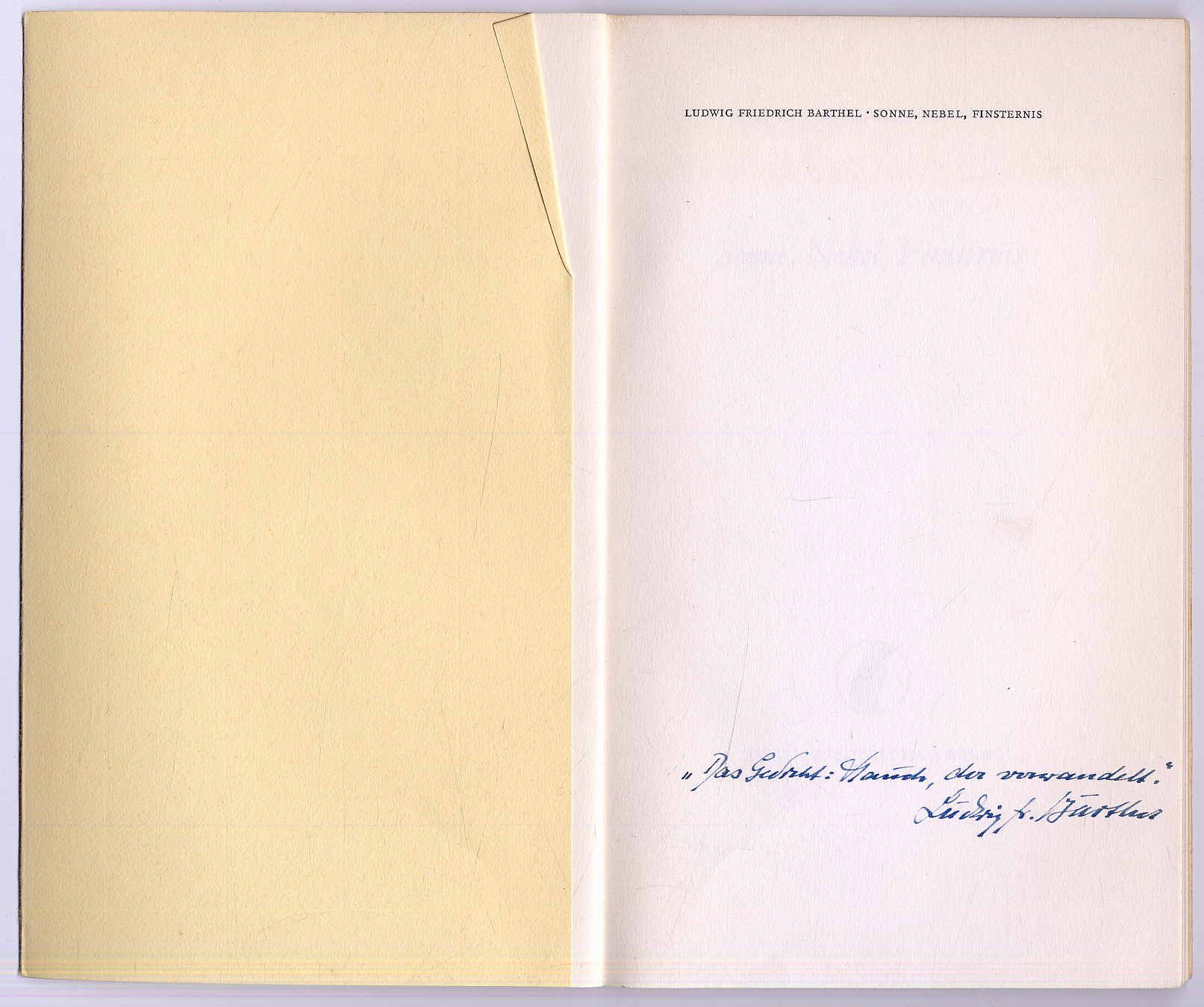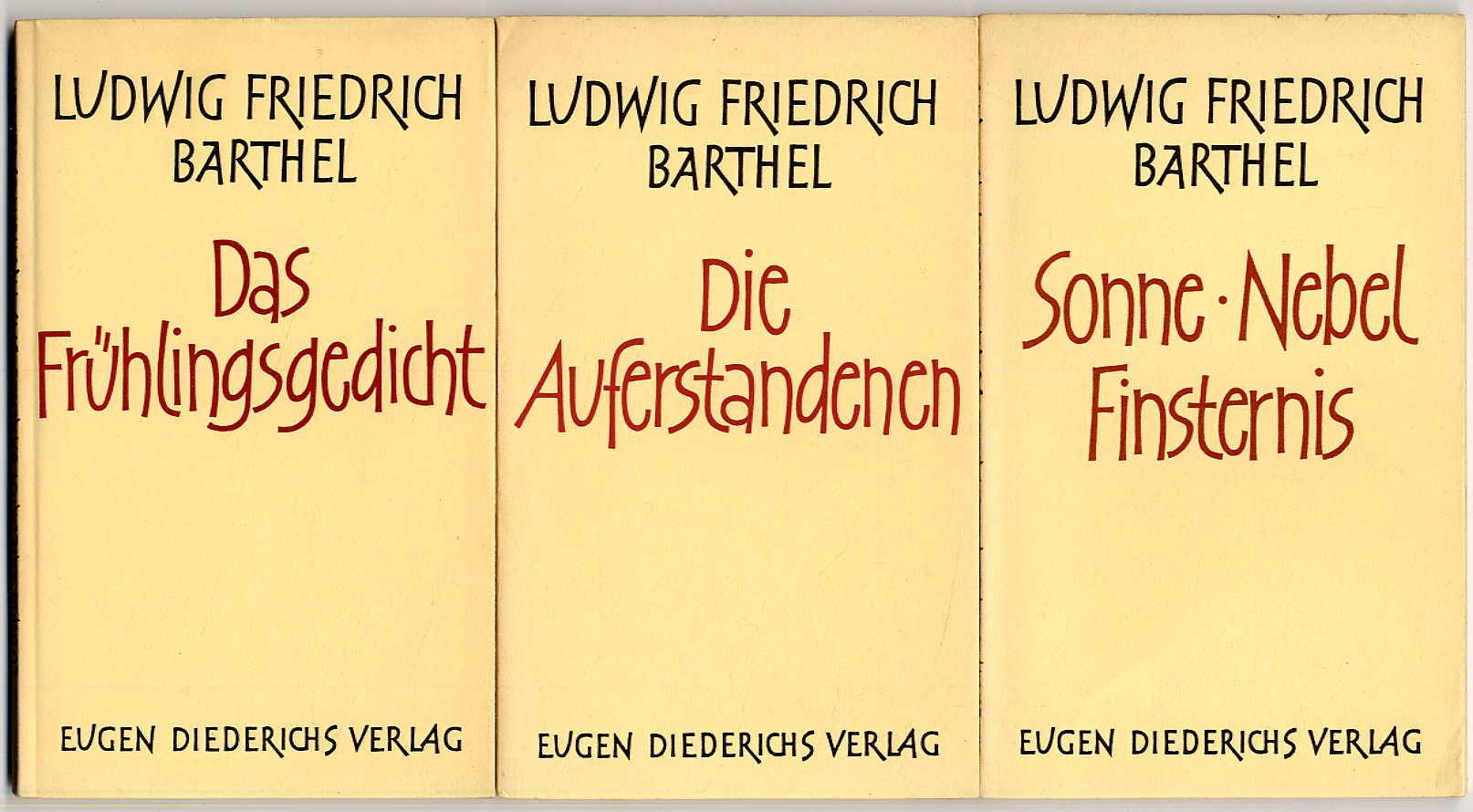 Barthel, Ludwig Friedrich: 3 Erstausgaben mit eigenhändiger Widmung: Das Frühlingsgedicht. Die Auferstandenen. Sonne, Nebel, Finsternis. Jena, Eugen Diederichs Verlag, 1958-1961. Ca. 22 x 13 cm. 47 S., (2) Seiten; 55 S., (5) Seiten; 45 S., (3) Seiten. Orig.-Broschuren. Jedes Exemplar mit eigenhändiger Widmung und Unterschrift Ludwig Friedrich Barthel (1898-1962). Gute Exemplare. Erstausgaben, WG 46, 45 und 48.