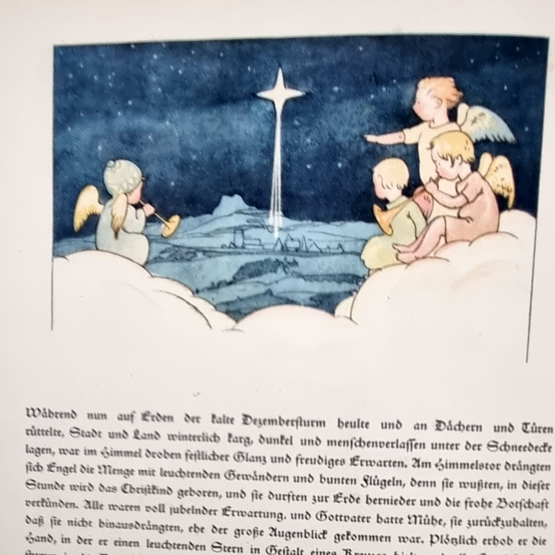 Mönkeberg-Kolmar, Vilma: Die Erzählung von der Weihnachtskrippe. (Einbandtitel: Heut war es/ wo der heil’ge Christ ein Kind/ wie du/ geworden ist. 9. Auflage. Oldenburg, Nürnberger Bilderbücher Verlag Gerhard Stalling, ca. 1925. Ca. 29,5 x 23 cm. 20 unpagin. Seiten mit farbigen Textillustr. und 3 farbigen Vollbildern von Else Wenz-Vietor. Farbig illustr. Orig.-Halbleinenband. Liebert-Stalling 26; Bilderwelt 1154. „Der Umschlagtitel verkündet, daß der heilige Christ ein Kind wie du geworden ist. Das versuchen Text und Illustration auch einzhalten. Der Versuch einer Illustratorin lustiger Kinderbücher, das „Ehre sei Gott in der Höhe“ auf die allzu kindgemäße „kleine Engelchen-Weise“ ertönen zu lassen, ist typisch für die niedlich heile Welt … der zwanziger Jahre.“ Einbandrand und Seitenränder leicht fleckig. Namenszug auf Vorsatz. Gutes Exemplar.