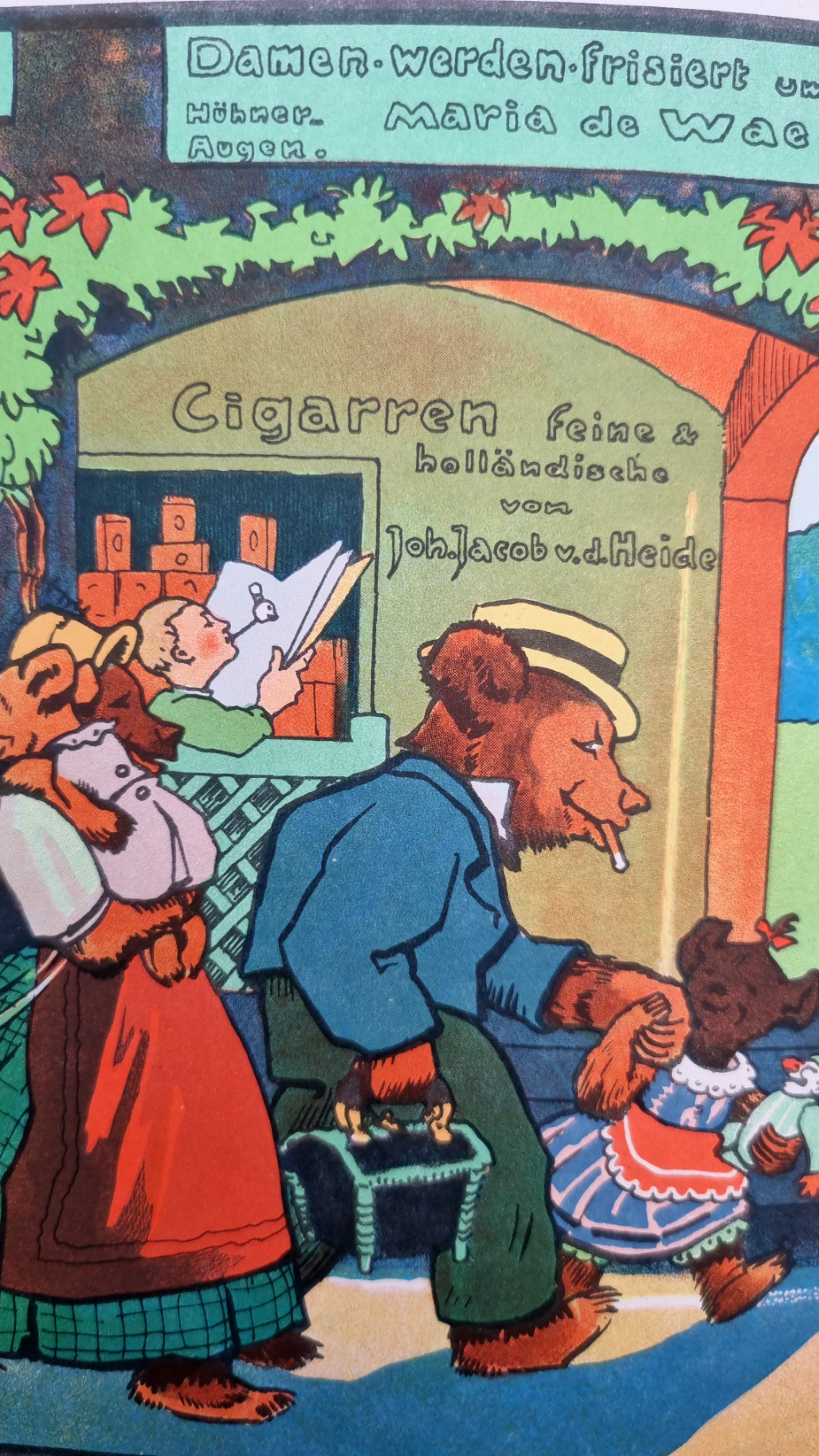 Seidel, Ina: Familie Mutz. Ein Bilderbuch. Mainz, Jos. Scholz, [1947]. Querformat, ca. 22 x 29 cm. 16 unpaginierte Seiten. Mit vielen Illustrationen (davon 8 ganzseitigen farbigen) von Eugen Osswald. Farbig illustr. Orig.-Halbleinenband. Klotz 6737/1. Die Bärenfamilie Mutz am Kaffeetisch, beim Einkaufen am Markt, beim Stadtspaziergang, auf dem Land, im Gebirge, beim Bootsfahren, „Stilistisch schließt O(sswald) mit seinen deutlich konturierten und flächig angelegten Figuren an G. Caspari an, gewinnt aber vor allem in der Benutzung der Farbe und in der Natürlichkeit der dargestellten Tiere eigenständige Gestaltungskraft.“ (H. Müller in LKJ II, 617). Einbandkanten minimal bestoßen, Seitenränder leicht fingerfleckig, gutes Exemplar.