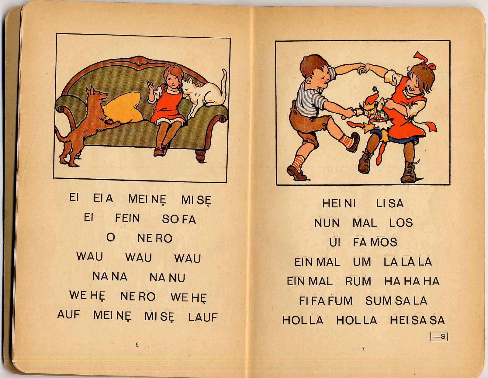 Haijer, Jan; Fritz Köhlhoff und Otto Zimmermann: Froh und Frei. Erstes Lesebuch für die Kinder des westfälischen Industriegebiets. Im Auftrage des Westfälischen Lehrervereins verfaßt. Vielfach geänderte Ausgabe für evangelische Schulen. Dortmund, W. Crümell, ca. 1930. Ca. 23 x 16 cm. 100 Seiten. Mit zahlreichen farbigen Bildern von Ernst Kutzer. Farbig illustrierter Orig.-Karton. Titelblatt mit Stempel „Initiative deutsche Schrift …“. Einband etwas bestoßen, Rücken kleine Fehlstelle. Teistler 2581.1; Shindo 492. Seltene Regionalfibel für evangelische Schulen.