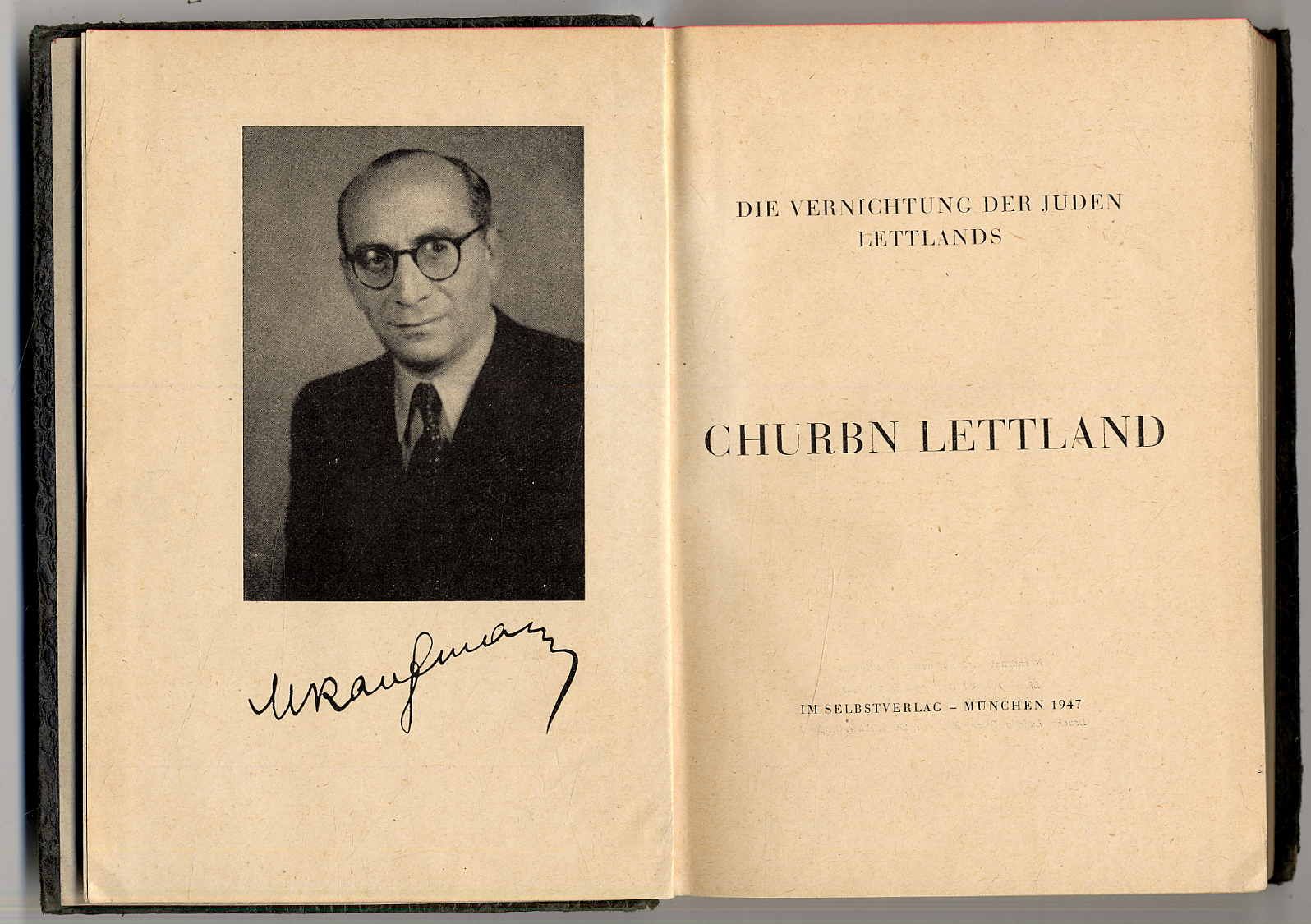 Kaufmann, Max: Churbn Lettland. Die Vernichtung der Jugen Lettlands. München, Im Selbstverlag, 1947. Ca. 20,5 x 14,5 cm. 542 Seiten. Mit einem Titelbild-Porträt und einigen Abbildungen. Illustrierter Orig.-Pappband. Einband berieben, Rücken mit kleineren Einrissen. Als Holocaust-Überlebender schildert Max Kaufmann (1897-1987) in seinem Buch seine eigenen Erinnerungen und die weiterer Überlebender der lettischen Juden. „Sechs entsetzliche Jahre liegen hinter mir und erst jetzt beginne ich mit der Niederschrift meiner Erinnerungen „Churbn Lettland“. Schon oft während meiner Leidenszeit habe ich zu schreiben versucht, aber immer, wenn ich von einem Ghetto ins andere, von einem Konzentrationslager ins andere geschleppt wurde, mußte ich, das bis dahin Geschriebene vernichten. … Ich möchte auf meine Art dazu beitragen allen Umgekommenen ein bleibendes Denkmal zu errichten. … Ich möchte die Welt davon in Kenntnis setzen, wie groß auch der Anteil der einheimischen lettischen Bevölkerung an unserer Tragödie war.“ (Vorwort). U.a.: Die Geschichte vom Jüdischen Kibuz in Lettland; Der Anfang zur Vernichtung der Rigaer Juden; Das kleine Rigaer Ghetto; Die Kunst in den Rigaer Ghettos und Konzentrationslagern; Männer in der Rolle von Frauen; Das blutige Schlock (Sloka) gewidmet meinem umgekommenen einzigen Sohn Arthur; Die jüdische Stadt Dwinsk; Rositten; Zemgale, Kurzeme und Vidzeme; Konzentrationslager „Kaiserwald“, Riga; Kleine Konzentrationslager; Die Evakuierung; Konzentrationslager „Stutthof“; Konzentratinslager „Buchenwald“; Der Weg in die Freiheit.