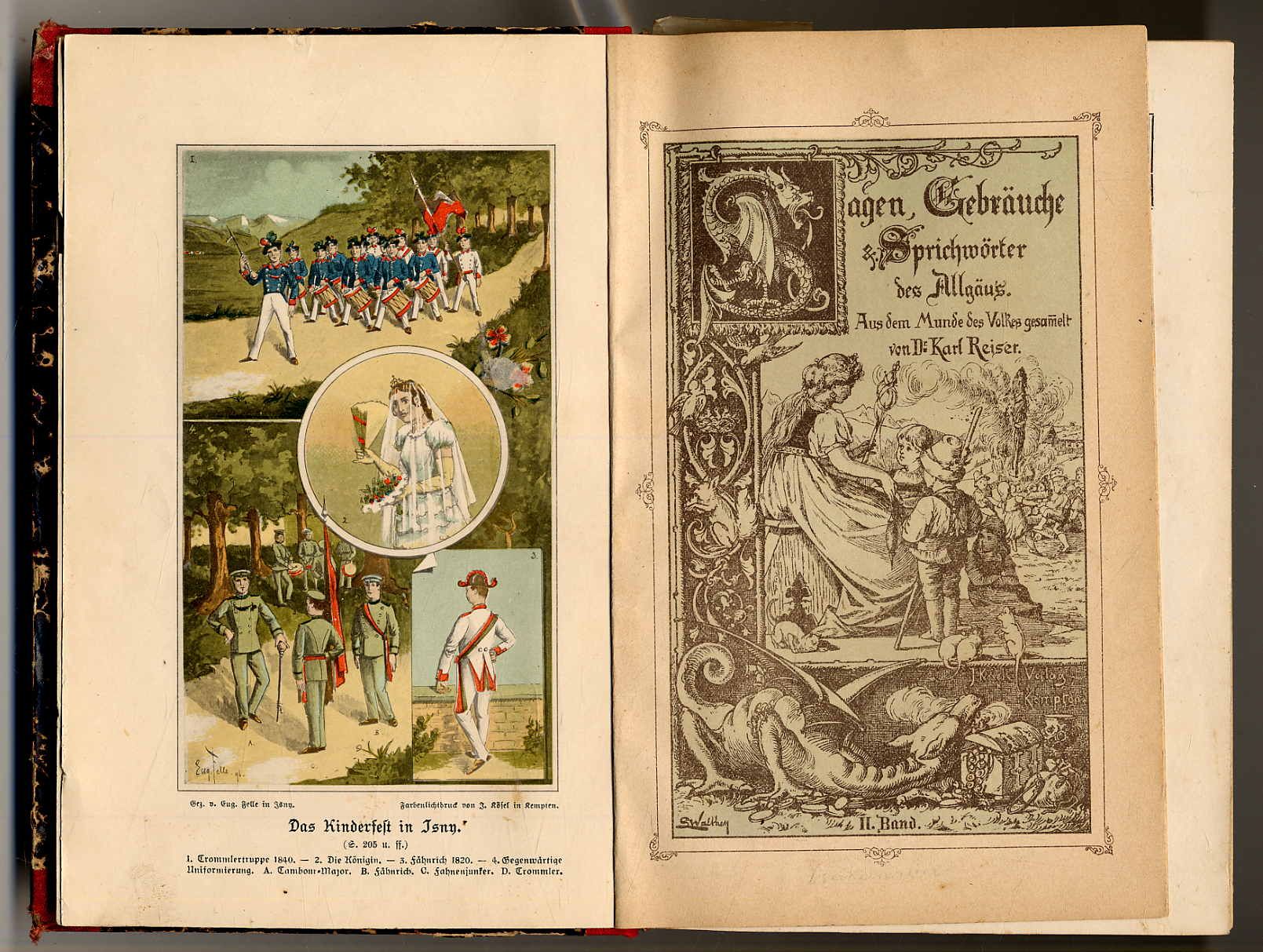 Reiser, Karl: Sagen, Gebräuche, Sprichwörter der Allgäus. Aus dem Munde des Volkes gesammelt. 2. Band. [Kempten, Kösel, 1897]. Ca. 21 x 15 cm. V S., 764 Seiten. Mit einem farbigen Frontispiz und einigen Textabbildungen. Halbleinenband der Zeit mit geprägtem Rückentitel. Der erste Band erschien bereits 1895. „Der vorliegende zweite Band enthält Darstellungen von Volkssitten und Bräuchen, eine gedrängte Besprechung des Lautstandes und der Eigenarten der Mundart und im Anschluß hieran das Ergebnis der Sammlung von Volkssprichwörtern, sprichwörtlichen Redensarten und mundartlichen Ausdrücken.“ (Vorwort). Einbandkanten bestoßen, sonst gutes Exemplar.
