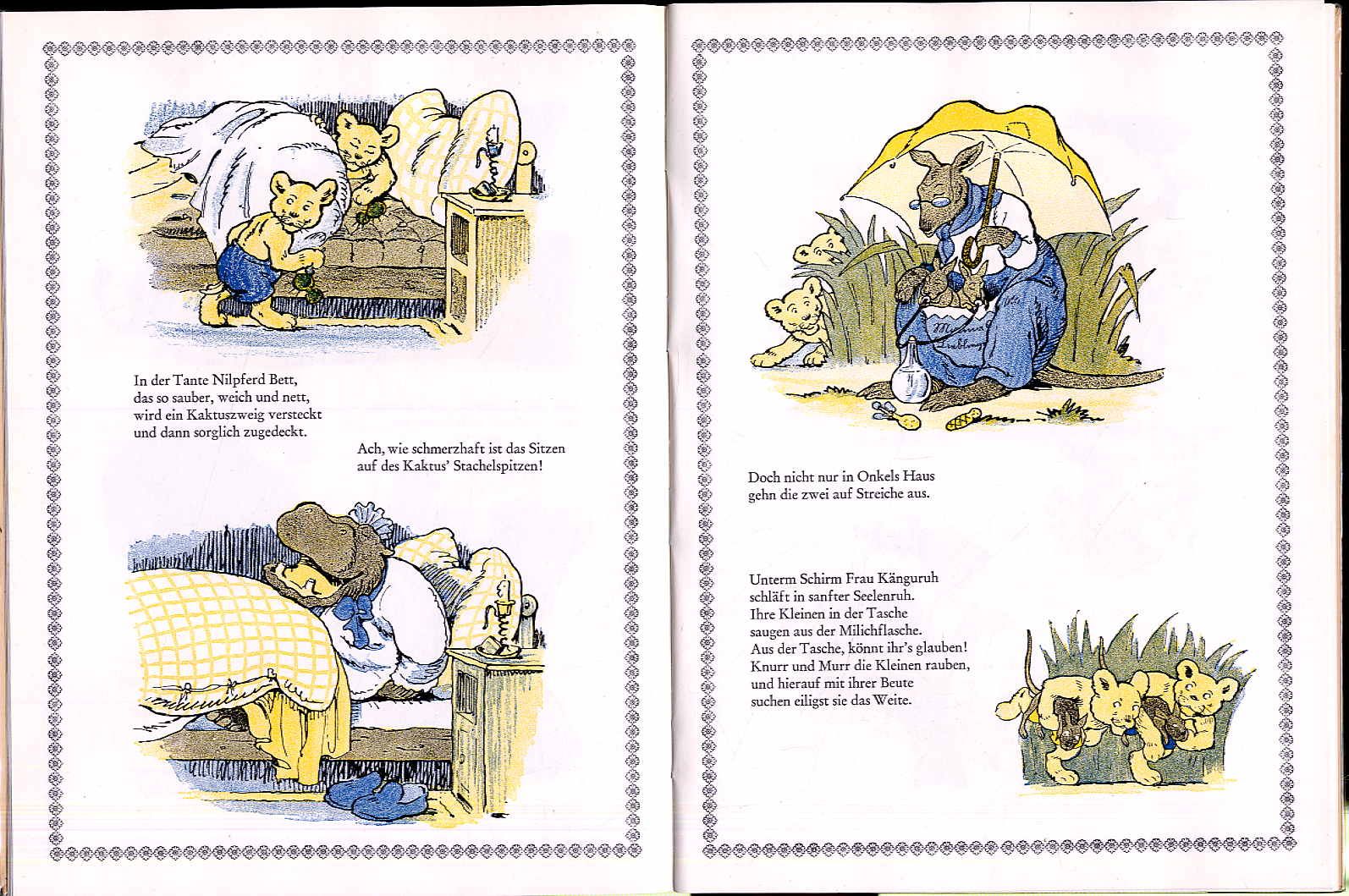 Rikli, Herbert: Knurr und Murr, die Löwenknaben. Ein lustiges Bilderbuch mit Versen. VI. Auflage. Basel, Frobenius AG, [1975]. Ca. 26,5 x 20,5 cm. (24) Seiten mit farbigen Illustrationen. Farbig illustr. Orig.-Halbleinenband. Sehr gutes Exemplar.
